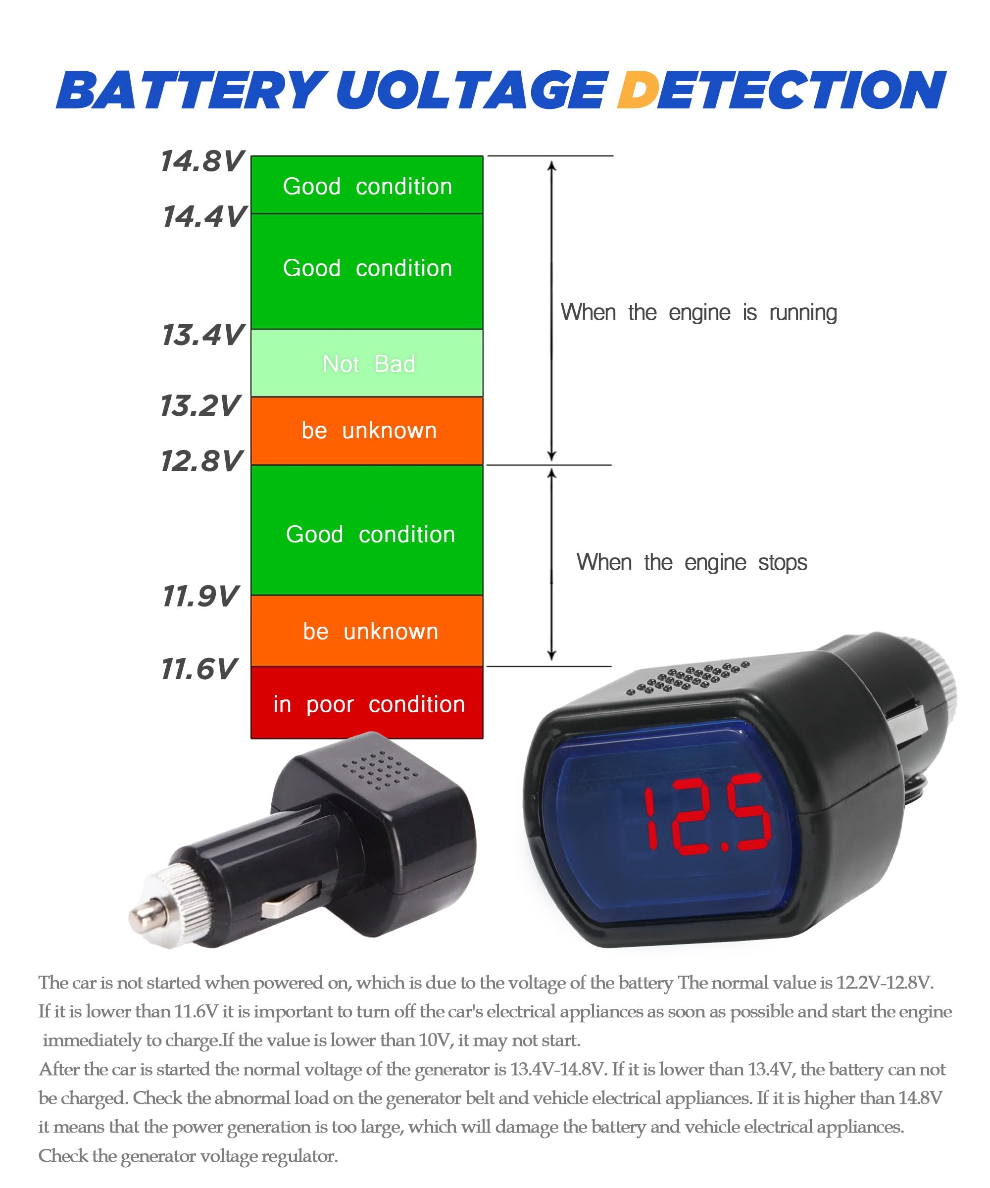 Curieux-TEMPSA TESTEUR Voltmètre Batterie LED Allume Cigare Digital Voltage Pr Voiture DC12-24V [Affichage LCD]: L'affichage de tubes numériques brillant est très facile à regarder, ce qui vous convient de comprendre l'état de charge au fil du temps et de saisir clairement l'état de tension de la batterie entre la charge complète et la décharge de ce voltmètre DC. Testeur Batterie Voiture Allume-cigare ShuoHui 12–24 V LED Allume-cigare Batterie Voiture Testeur Voltmètre Indicateur De Tension Testeur Voltage Prise Cigare Parfait pour la protection du système électrique automobile, protégez le système électrique de la voiture de tout dommage potentiel, testeur de voltmètre numérique [Largement applicable]: Le voltmètre de tige de cigarette de voiture convient aux batteries 12 V et 24 V. Très adapté à la protection du système électrique de voitures, protégez le système électrique de la voiture de tout dommage potentiel, testeur de voltmètre numérique Greluma 1 Pièce Voltmètre numérique LED DC 12 V/24 V, jauge de tension étanche à montage sur panneau, testeur de batterie pour voiture, bateau, moto, camion... [Largement applicable]: Le voltmètre de tige de cigarette de voiture convient aux batteries 12 V et 24 V. Résolvez facilement le problème de l'identification des batteries du véhicule. Très adapté à la protection du système électrique de voitures, protégez le système électrique de la voiture de tout dommage potentiel, testeur de voltmètre numérique. Branchez simplement la prise du produit dans la prise de cigare -Applicable: Convient pour les batteries 12V et 24 V. Branchez simplement la prise du produit dans la prise de cigare. Tension applicable: 12v-24V Sortie normale: 12-12,8 volts (allumage sur) et 13,4-14,8 volts (moteur sur) Qu'est-ce qui est inclus dans la boîte? -1 VILTMETER DE CIRG CIGRACT Nos avantages de produit -Material: en ABS de haute qualité, PC et carte électronique, sûr, fiable, durable et stable -Fonction: assure une mesure précise et fiable de la tension de la voiture pour une surveillance précise -Avantage: l'affichage de tube numérique à haut brillant est très facile à regarder -Installation: facile à installer et à utiliser.