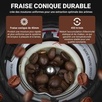 Tirez le meilleur de chaque grain avec cette machine a cafe grain haute performance. Moulin A Grain Moulin à Café Amzchef Moulin A Café, Moulin à Café à Fraise Conique En Inox, 24 Réglages Précis AMZCHEF Moulin Café 48 Réglages Notre moulin a cafe electrique offre 48 niveaux de mouture, du fin au grossier. Amzchef Moulin à café électrique - acheter sur 40 mm Mouture conique haute précision- Les meules coniques en acier de 40 mm de ce moulin a cafe electrique tournent lentement pour préserver arômes et huiles, offrant une crema onctueuse. Les particules uniformes garantissent une extraction parfaite avec ce moulin à café electrique, choix des baristas EU. Ce moulin café electrique peut contrôler avec précision le nombre de tasses de 2 à 12 pour le café filtre. Vous pouvez même ajuster la durée de mouture de 0,5... Un bouton unique et le doseur intégré rendent la préparation fluide. Ce moulin à café electrique garantit des résultats de qualité barista à la maison. 99 % de rendement – Chambre propre et sans résidus. Conception antistatique - Nettoyez votre cuisine avec le moulin à café électrique AMZCHEF. Hopper grande capacité 250 g – Café rapide et efficace Ce moulin a cafe electrique avec verrouillage peut contenir 250 g de grains. La chambre innovante de ce moulin à café assure une extraction de 99 % de la mouture, sans dépôt ni goût rance.