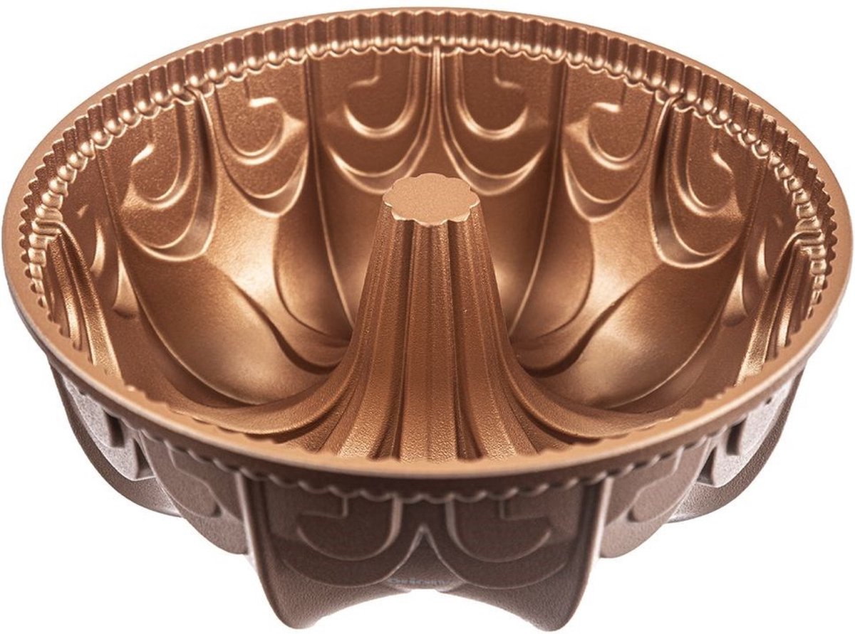 Moule Turban Revêtement Antiadhésif avec Cheminée MARISSA 24 cm - Moule de Cuisson Turban Moule Cheminée Antiadhésif Cuivre Ancien Moule à Kouglof En Cuivre étamé Moule à Gâteau Cuivre Résistant 200°C Moule à cupcake avec une cheminée d'un diamètre de 24 cm. Idéal pour préparer des babka avec un beau style oriental. Le moule est peint au pistolet en couleur cuivre Utile : moule de la série Marissa, avec ouverture en forme de cheminée pour la cuisson du kouglof. Dimensions : 23,5 x 2,5 x 3,5 cm · Matériau : Fonte d'aluminium · Revêtement : Antiadhésif très résistant · Température maximale supportée : 230°C · Coloris : Rose... Résistant aux températures élevées (jusqu'à +200 °C). Revêtement anti-adhésif : le moule est muni d'un double revêtement antiadhésif PFLUON de couleur cuivre.