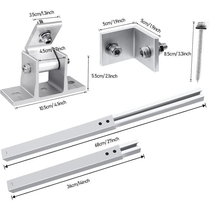 Liste de colisage : 4 supports fixes en L, 2 supports à bascule, 6 vis à bouton en plastique M8, 6 vis hexagonales M8, 6 écrous à ailettes M8, 4 écrous à bride M6, 4 rondelles plates M6, 4 rondelles à ressort M6 et 6 auto-perceuses de 5,5 x 1,49 pouces Vis cylindriques. Structure Panneau Solaire Robuste Support De Panneau Solaire Universel Zelsius, Angle Réglable, Kit De Montage En Aluminium Pour Support Inclinable 0-90 Degrés Support de panneau solaire de 104 cm - Angle réglable de 0 à 90 degrés : Pour installer un système de panneau solaire complet à monter soi-même sur les caravanes, les toits de camping-car pour installation solaire hors réseau, ce que vous espérez est de générer plus d'énergie solaire. NuaSol 4x support PV pour panneau solaire ontage en hauteur jusqu'à... Matériau robuste : le support de panneau solaire est composé d'une élévation photovoltaïque stable qui se caractérise par une capacité de charge exceptionnelle, une épaisseur de matériau de 3 mm, des améliorations porteuses à la pression et au vent, et peut résister à toutes les conditions climatiques. Haute efficacité : obtenez jusqu'à 25 % d'efficacité de panneau solaire en plus en inclinant vos panneaux vers le soleil au lieu de les poser à plat. Equipé de robustes supports d'angle solaire, ce système est idéal pour les toits plats, les terrains ouverts ou les installations sur balcons où la flexibilité... Polyvalent : supports de panneau solaire réglables pour les installations solaires hors réseau, telles que les camping-cars, les camping-cars, les toits, les abris de jardin ou toute autre surface plane. Contenu de l'emballage : 4 supports fixes en L., 2 supports inclinables. Installation facile : installez vos supports de panneau solaire horizontalement ou verticalement avec un angle d'inclinaison réglable de 0º à 90º. Lot De 4 Supports De Montage Inclinables Pour Panneau Solaire Réglable 6 vis à bouton en plastique M8., 6 vis hexagonales M8., 6 écrous à ailettes M8., 4 écrous à bride M6., 4 disques plats M6., 4 rondelles à ressort M6., 6 vis cylindriques autoforeuses de 14 x 4 cm. Montage rapide avec des fermoirs en acier inoxydable et un positionnement précis des trous.