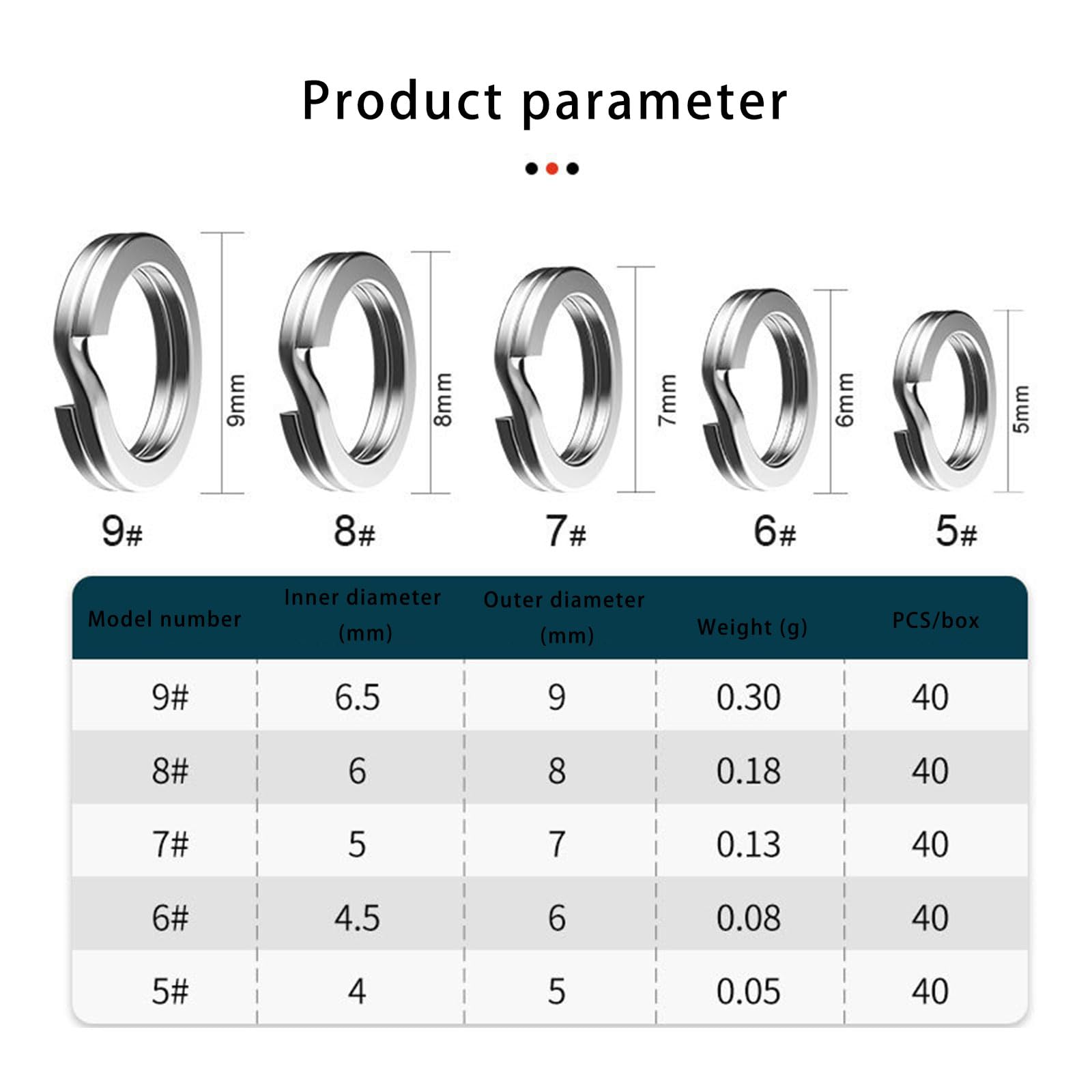 Connecteurs Pour Leurres WMYCONGCONG 200 Pièces Anneaux Fendus En Acier Inoxydable Connecteurs Leurres Acier Inoxydable Ensemble de 200 anneaux fendus et pinces de pêche. Les anneaux fendus comprennent 5 tailles différentes : 5x3,5 mm, 6x4,5 mm, 7x5 mm, 8,5x6 mm... Outillage pêche - Anneaux fendus - No.6 - 60 pièces - Acier inoxydable Différentes spécifications : Résistance de 30 à 120 livres en fonction de la taille. Anneaux fendus de pêche 200pcs Kit d'anneaux fendus en Acier Inoxydable... Convient pour l'eau de mer et l'eau douce. Kit d'anneaux pour leurres de pêche comprenant 5 tailles, 5mm/6mm/7mm/8mm/9mm, 40 pièces de chaque taille, bien emballées dans une boîte en plastique par taille pour un accès et un stockage faciles. La pince à pêche est conçue avec un verrou de sécurité, plus sûre à utiliser, et assez tranchante pour couper rapidement toute ligne PE ou ligne de pêche solide, utilisée pour enlever les hameçons, transporter les poissons, couper la ligne de poisson, couper le fil d'acier, la ligne d'attache, etc. La pince à pêche et les anneaux de pêche fendus sont fabriqués en acier inoxydable de haute qualité, robuste et fiable, très solide, résistant à la rouille, adapté à la pêche en eau salée et en eau douce.