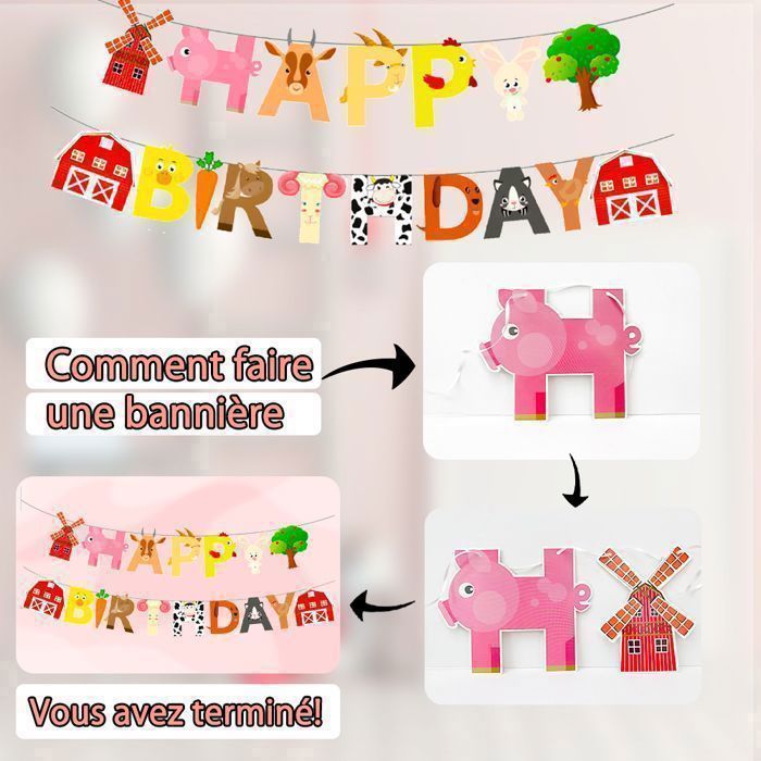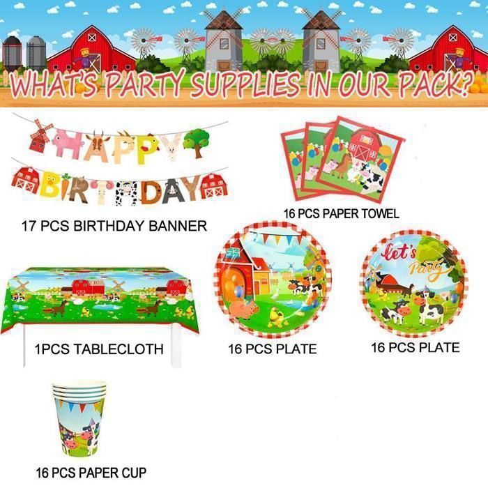 Assiettes - Assiettes, gobelets, serviettes - Décoration Idéal Enfants Fête Champêtre Décorations Anniversaire - Animaux De La Ferme - Ensemble Complet Décoration Anniversaire Ferme Kit vaisselle Eid Mubarak Les illustrations animales et les éléments agricoles conçus avec soin stimulent l'imagination des enfants et transforment chaque fête d'anniversaire en une joyeuse aventure à la ferme Assiettes Anniversaire Animaux De La Ferme, Set Vaisselle Jetable... Avec notre décoration d'anniversaire de ferme, vous pouvez embellir votre fête de manière poétique et élégante Vous recevez : 20 x serviettes, 10 x assiettes de 9 pouces, 10 x assiettes de 7 pouces et 1 x banderole 'Happy Birthday