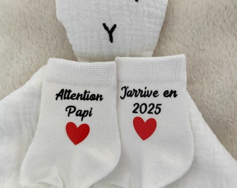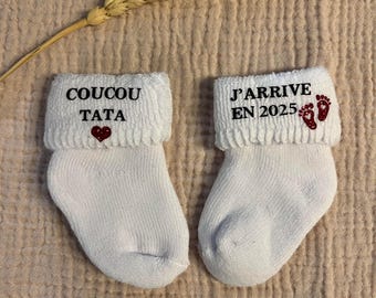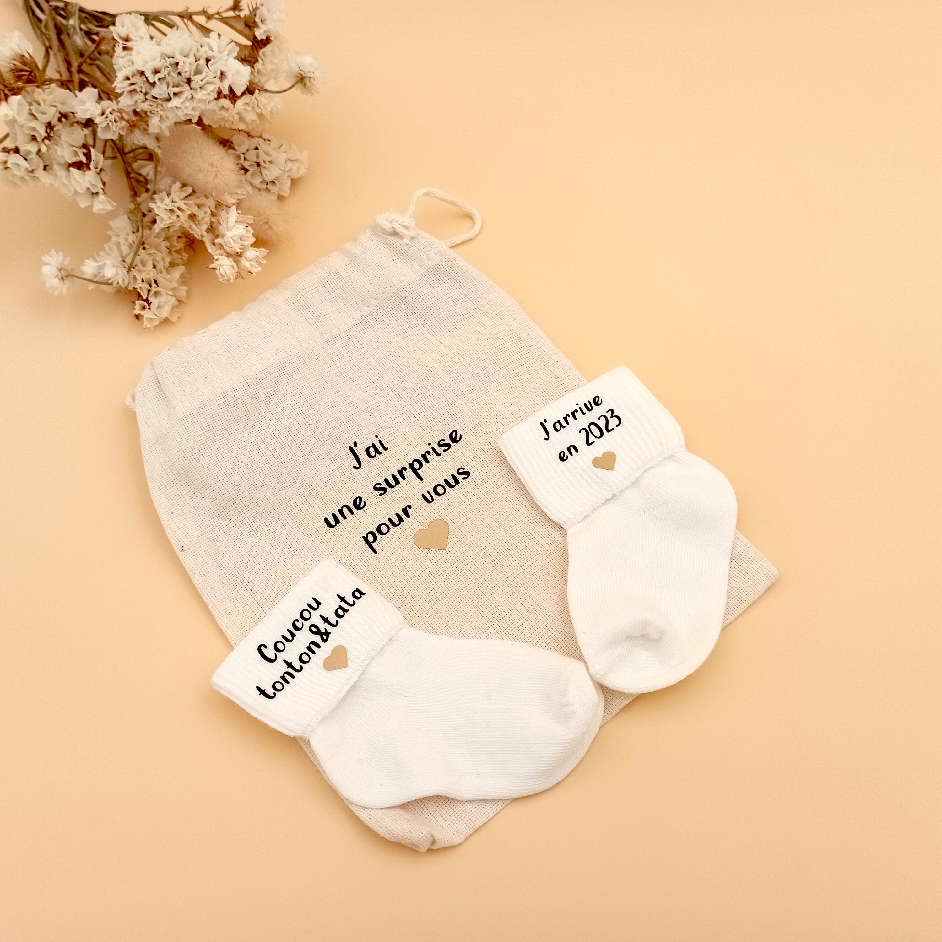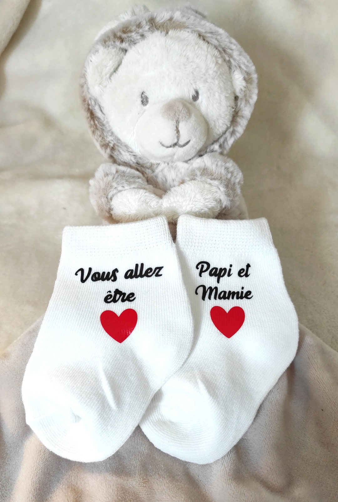 Souvenir Grossesse Fait Main Chaussettes Bébé Annonce Grossesse - Coucou Papy & Mamie - Assortis Moi Annonce Grossesse Mamie Fabriqué par EdeneetLou · Déco de fête pour réunions et célébrations · Envoyé par une petite entreprise basée ici : France · Matériaux : Coton 10 idées originales pour annoncer sa grossesse - Trois Kilos Sept Vous avez également la possibilité de choisir le message de votre choix, la couleur, la police d’écrite et le dessin. Générique · chaussettes de bébé pour annonce de grossesse à la famille, maman, mamie, papi, papy, tonton, tata - thème surprise · 6,00 €6,00€ · Livraison à 4,50... chaussettes avec texte personnalisable pour annonce de grossesse POURQUOI DES CHAUSSETTES ? Elles seront une très jolie idée pour une annonce de grossesse au futur papa. PERSONNALISATION : Vous souhaitez ces chaussettes dans la taille et la couleur de votre choix, prenez contact avec moi. CHAUSSETTES POUR BEBE D’ANNONCE DE GROSSESSE – COUCOU J’ARRIVE EN 2026 Chaussettes pour bébé 100% personnalisables sur le thème de l’annonce de grossesse avec message : Coucou j’arrive en 2026 avec petits cœurs rouges à paillettes.