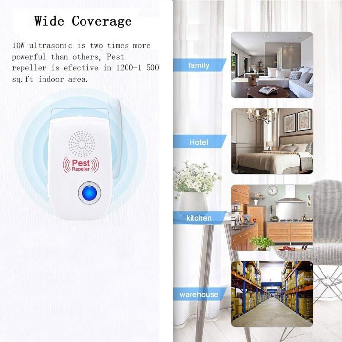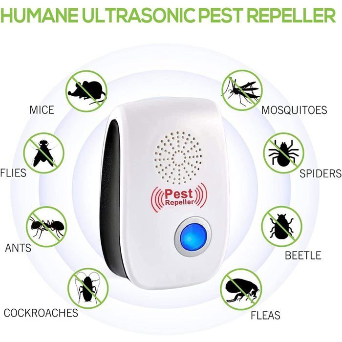 2pcs Répulsif Ultrason Anti Rongeurs Insectes,Répulsif Électronique 【Couverture efficace】les répulsifs d'insectes sont efficaces dans des zones de moins de 1200 mètres carrés. Anti Souris Rats Moustiques Ultrason Anti Moustique,6 Pack Ultrason Souris Et Rats Répulsif Ultrason Moustiques Il est recommandé de les installer à une distance de 30 à 70 pouces du sol. Dès les premiers jours, j'ai constaté une nette diminution des moustiques et des fourmis dans la maison. Fini les piqûres en pleine nuit et les petites colonies... Silencieux et économe en énergie]Ultrason Anti Moustique utilise l'original des ultrasons à basse fréquence pour repousser les parasites, il ne fera pas de bruit pendant l'utilisation. Avec une consommation d'énergie de seulement 3 - 5W. Voir plus de détails 【Sûr et Respectueux de l'environnement】Le produit Répulsif Ultrason Anti-Rongeurs Insectes adopte une forme physique pour repousser les souris et les parasites de votre maison au lieu de les tuer. Appliquer dans les bureaux, appartements, supermarchés, entrepôts, hôtels ou autres lieux. Nous nous consacrons à optimiser les Ultrason Anti Moustique, à améliorer leurs performances, à fournir des produits de haute qualité, durables et satisfaisants. Et il ne nécessite pas de piles, il suffit de le brancher verticalement dans une prise électrique. Cependant, parce que les murs et les objets solides peuvent affaiblir l'effet ultrasonique, nous suggérons que chaque pièce soit équipée d'au moins un équipement. 【Nouvelle technologie de puces】Le répulsif à ultrasons dispose de la dernière puce mise à jour qui émet de puissantes ondes ultrasoniques qui perturbent efficacement l'ouïe et le système nerveux des nuisibles comme les souris, les rats, les araignées, les mouches, les cafards, les fourmis, les moustiques et plus encore, les rendant mal à l'aise et s'enfuyant progressivement.