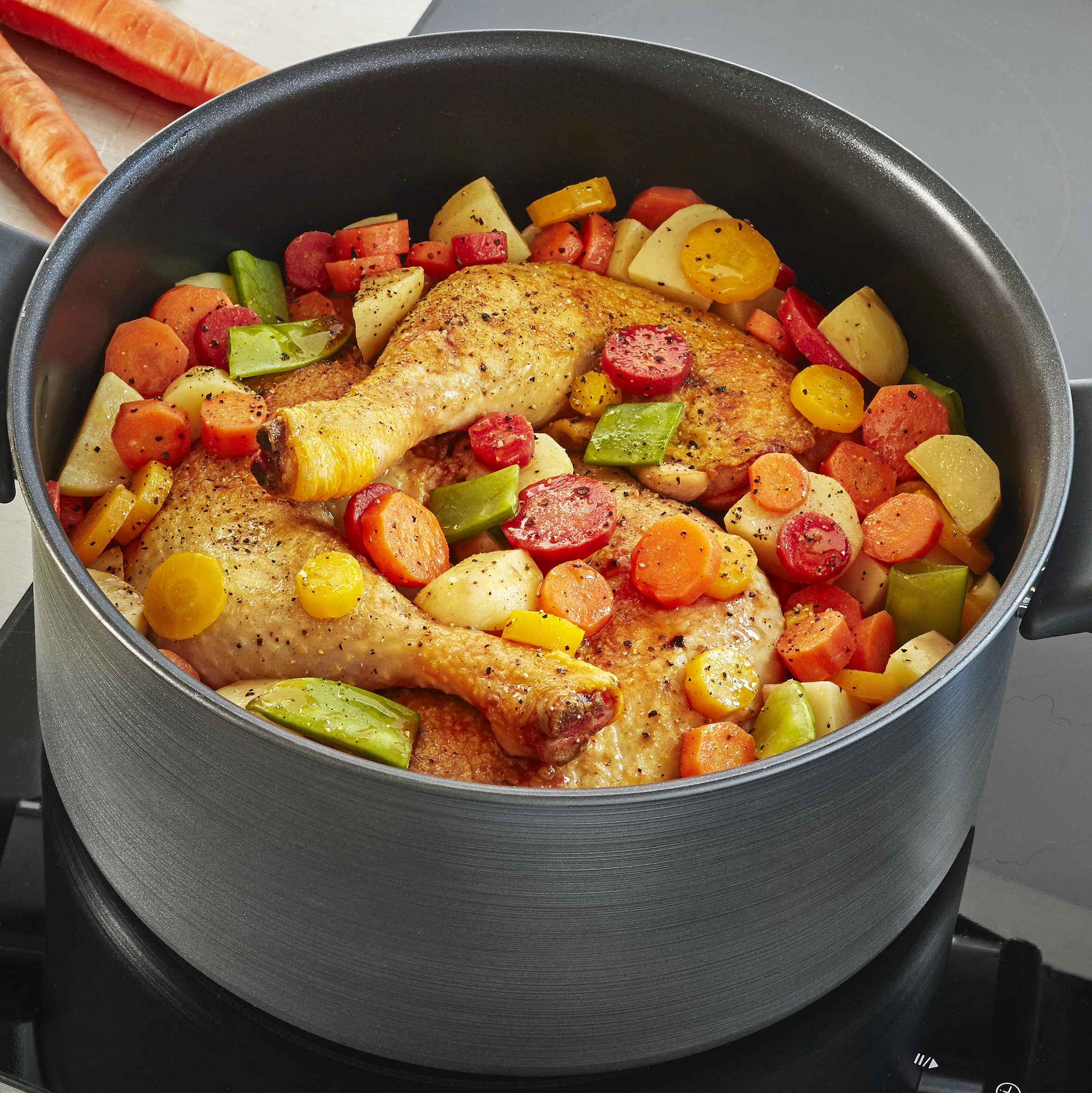 Tefal Faitout 24 cm, Induction, Acier inoxydable 18/10, Garantie 10 ans Compatible avec tous les types de feux, y compris l’induction, ce faitout vous assure des résultats impeccables à chaque utilisation. Avec son couvercle en verre transparent, son bord verseur pratique et ses poignées fixes solides, il combine praticité, durabilité et élégance Revêtement Titane Durable Tefal Stone Strength Faitout Anti-adhésif En Aluminium Renforcé Avec Batterie Tefal Du poulet grillé à la salade César parfaite aux quesadillas irrésistibles et aux poêles de petit-déjeuner faciles à préparer qui font passer le brunch à un tout nouveau niveau, la gamme Tefal Generous Cook est la réponse parfaite à des repas délicieux et copieux que tout le monde appréciera. Il y a même un indicateur de chaleur Thermo-Signal™ qui change de couleur quand il est temps de commencer la cuisson, pour des résultats parfaits à chaque fois. TEFAL Faitout induction couvercle UNLIMITED 24 cm - 5 Litres pas cher... Le secret est sa forme profonde et généreuse qui peut gérer des idées de recettes infinies Son revêtement antiadhésif en titane durable et sûr rend la cuisson facile, tandis que la technologie avancée à induction thermo-fusion assure un chauffage rapide et des résultats de cuisson homogènes. Compatible avec toutes les cuisinières, y compris l'induction, Generous Cook vous couvre, vous et vos proches. Revêtement extérieur/finition : revêtement antiadhésif Chez Tefal, tout ce que nous fabriquons, nous fabriquons avec soin depuis plus de 60 ans.
