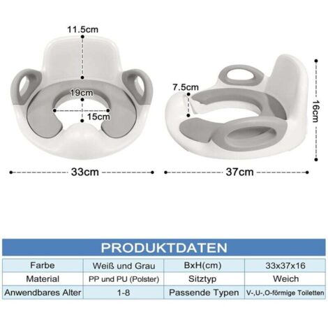 NAIZY Siège de Table pour Enfants Portable Pliable 30x24x31CM... PP de qualité supérieure Séchage rapide, vous n'avez pas à vous soucier d'une longue durée d'utilisation après le lavage 【Siège de toilette pour enfants】 La taille globale est de 33 x 37 x 16 cm et la taille de l'anneau intérieur est d'environ 19 x 15 cm. Il y a aussi un dossier de 11,5 cm de haut à l'arrière, qui est conçu de manière ergonomique pour rendre l'utilisation des toilettes plus confortable pour les enfants. Le poids n'est que de 0,82 kg, ce qui est facile à transporter. NAIZY Siège de toilette pour enfant en polypropylène et polyuréthane antidérapant avec poignée et protection anti-éclaboussures Les toilettes séparées pour adultes et enfants peuvent être plus hygiéniques et renforcer l'indépendance des enfants. 【Applicable】Les toilettes en forme de O, en forme de V et en forme de U qui sont courantes à la maison peuvent être utilisées, adaptées aux garçons et aux filles âgés de 1 à 8 ans. Yakimz Pot Enfant Pot Bébé WC, Siège de toilette Enfant Pot Ne contient pas de BPA. Double adhérence qui le rend plus sûr et plus stable et offre à votre bébé un bon environnement d'auto-exercice avec tranquillité d'esprit. Siège Toilette Enfant Siège Panda Antidérapant Siège De Toilette Pliable Enfant - Apprentissage Propreté, Portable Avec Sac, Design Panda Siège Toilette Bébé Siège Ergonomique Dossier Haut 11,5 Cm Anneau 19x15 Cm Livré avec tous les accessoires Bandes antidérapantes à quatre points en bas + clips fixes, réglables librement à l'avant et à l'arrière, design antidérapant à quatre points. Design humanisé Le design résistant aux éclaboussures et le dossier droit sont ergonomiques. Grande adaptabilité Convient pour la plupart des toilettes domestiques, facile à utiliser Largement utilisé : avec son matériau PP haute densité respectueux de l'environnement et sa poignée pratique, ce siège de toilette pour enfant est excellent pour les garçons et les filles âgés de 1 à 8 ans, pour une utilisation à la maison et en voyage L'oreiller a été remplacé par un oreiller en PU plus adapté aux enfants qui se réchauffe en hiver et se refroidit en été afin que les enfants puissent aller aux toilettes plus activement. Données : Matériau : PP + PU (coussin) Couleur : Blanc/bleu/rose Type de siège : Doux Dimensions totales : 33 x 37 x 16 cm Dimensions de la bague intérieure : 15 x 19 cm Hauteur de protection anti-éclaboussures : 7,5 cm Hauteur du dossier : 11,5 cm Poids brut : 0,82 kg Dimensions de l'emballage : 33 * 14 * 36 cm Mais il ne convient pas aux toilettes carrées et intelligentes. 【Intime】 La partie avant du siège des toilettes a une conception de plaque anti-éclaboussures d'environ 7,5 cm, ce qui peut permettre aux enfants d'apprendre à utiliser les toilettes par eux-mêmes pour séparer efficacement leurs jambes pour utiliser les toilettes et éviter les éclaboussures d'urine sur le sol. Le dossier haut en forme d'œuf est conçu pour mieux protéger la colonne vertébrale de bébé, le coussin d'assise est équipé d'un bloc d'urinoir haut pour éviter les éclaboussures d'urine. Convient à la plupart des toilettes de taille standard.
