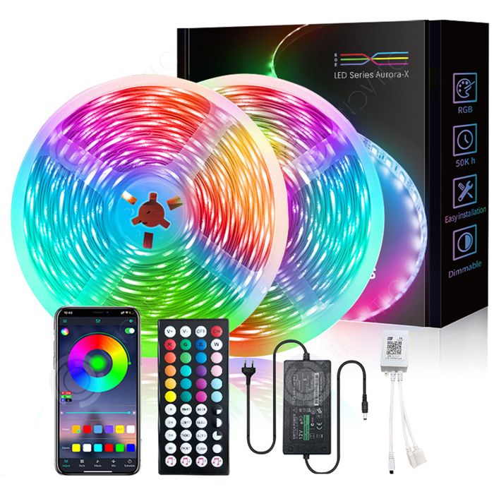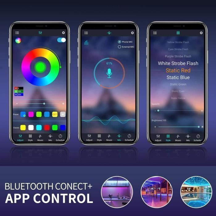 Mode Musique & Mode Micro La Bande lumineuse à LED avec fonction de contrôle de la musique peut ajouter une atmosphère active à votre fête. Boîte de réception x 1 (Remarque: le mode microphone ne signifie pas que la bande lumineuse LED dispose d'une commande vocale., ) Il s'agit d'un nouveau type de bande lumineuse RGB musicale. Ce kit de bandes lumineuses RGB peut clignoter au rythme de la musique, ce qui convient très bien à la décoration intérieure et à l'ambiance des festivals. Laissez-vous profiter de la belle atmosphère d'éclairage.Il s'agit d'un kit complet comprenant un adaptateur secteur, une télécommande RGB et un contrôleur de musique... 【Fonction de Synchronisation】Grâce à la fonction de synchronisation de la Ruban LED 10M, vous pouvez configurer la Bande LED pour qu'elle s'allume ou s'éteigne à tout moment via l'application. Même si votre télécommande tombe en panne ou n'est pas alimentée, vous pouvez toujours utiliser la Ruban LED normalement. Ruban LED 15M Bande LED RGB Bande Lumineuse Flexible Multicolore avec Télécommande à 40 Touches... Ruban LED Bluetooth pour les Fêtes 【Contrôle APP et Télécommande IR】Fournit plusieurs méthodes de contrôle. Ruban LED Fête Musique Aogled Ruban Led,bluetooth Bande Led 10m Avec Contrôle App Et Telecommande A 40 Touchesruban A Led Avec Synchronisation Musicalebandes Led 5050 Bande Led Rgb Pour Chambre Vous devrez acheter un connecteur à 4 broches supplémentaire pour vous reconnecter. Bande LED Bluetooth avec LED SMD 5050 Longueur: La longueur totale est de 10M, 1 rouleaux de Bandes LED. 【Adhésif Puissant et Installation Facile】La Aogled Ruban LED Bluetooth utilise un adhésif plus fort qui a une forte adhérence, vous n'avez donc pas à vous soucier de la chute de la Bande LED après une certaine période d'utilisation. 【Bande Lumineuse RVB Adaptée à Plusieurs Scènes】Ruban LED Bluetooth d'une longueur totale de 10M, adaptées à tout environnement intérieur, comme les chambres à coucher, les salons, les cuisines, les plafonds, les fêtes, les vacances, Noël, Halloween, etc., ( Non étanche) La LED bande dispose d'un mode musique intelligent et d'un mode MIC, La couleur des Bandes LED RVB peut changer avec le rythme de la musique ou du microphone. Une Bande LED plus intelligente peut vous faciliter la vie. Vous pouvez contrôler la Bande LED 10M via l'application. ) Largeur: 10 MM Puissance: 12 W Entrée: AC100-240V, 50Hz / 60Hz Sortie: DC24V / 0., 5A La longueur du cordon d'alimentation: Env., 130 CM Étanche: IP20 (Remarque: le connecteur n'est pas inclus. Description du produit Ruban LED avec Contrôle Bluetooth et Télécommande IR Comment utiliser correctement l'APP? Le nom de l'application est HappyLighting, veuillez rechercher et installer l'application dans Google Play ou Apple Store ou via le code QR sur le manuel du contrôleur. Étape 2: Assurez-vous que votre téléphone est compatible Bluetooth. Vous pouvez définir l'heure à laquelle la Ruban LED Bluetooth s'éteint automatiquement chaque nuit pour terminer votre journée bien remplie. Ruban LED, Led Chambre 10M Bluetooth Bande LED RGB 24V, Bande Lneuse LED RGB avec Contrôle d'App 12V Bandes LED 10M pour barre