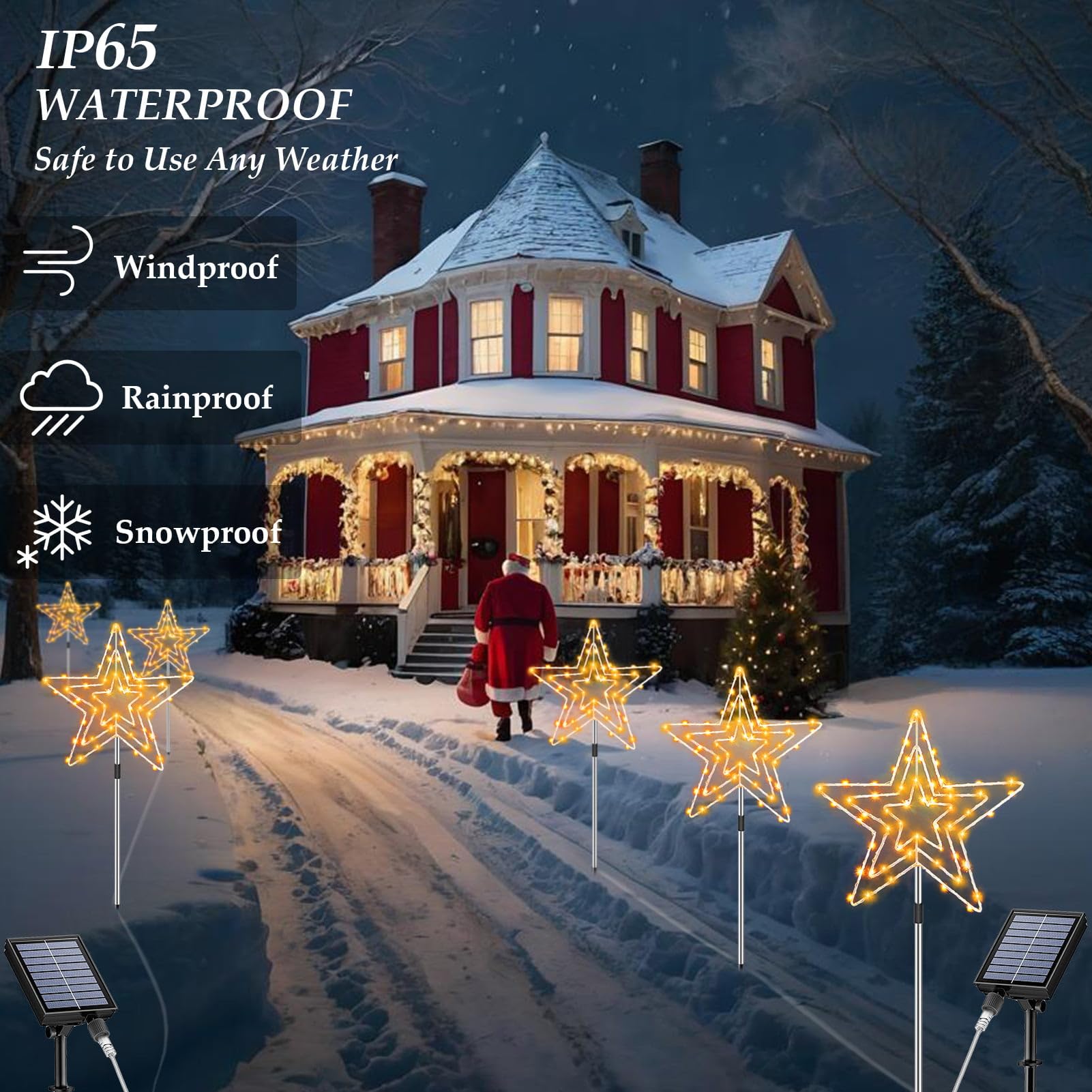 étoiles Lumineuses Solaires 75 LEDs Decoration Noel Exterieur Solaire, Arbre De Noël Solaire En Spirale En Guirlande Solaire Exterieur Lot de 3] Guirlande Lumineuse Exterieur Solaire, 3×12M 300 LED 36M Guirlande Guinguette Solaire Decoration Noel Exterieur Solaire Sapin, Sapin de Noel Artificiel... Comprend des piquets et des tiges extensibles (total 73 cm) + câbles (2m + 2×1m) pour une installation flexible en extérieur. Ajustez la luminosité facilement pour créer l’ambiance parfaite, opération intuitive. Illumination Noel Exterieur : Panneau solaire amélioré - L’Illumination Noel Exterieur dispose d’un panneau agrandi, 2 modes de charge (solaire + USB). Decoration Noel Exterieur Solaire 3-en-1 - Une panneau solaire performant alimente 3 dispositifs en forme d’étoile (30 cm chacun, 75 LEDs par unité). Batterie 1200 mAh : charge en 6-8h (solaire), éclairage 8-10h. Construite robustement, elle fonctionne fiablement toute la saison de Noël : idéal comme lumiere exterieur noel. Emballée élégamment (pas de conditionnement supplémentaire), elle est un cadeau précieux pour famille et amis. decoration exterieur solaire noel