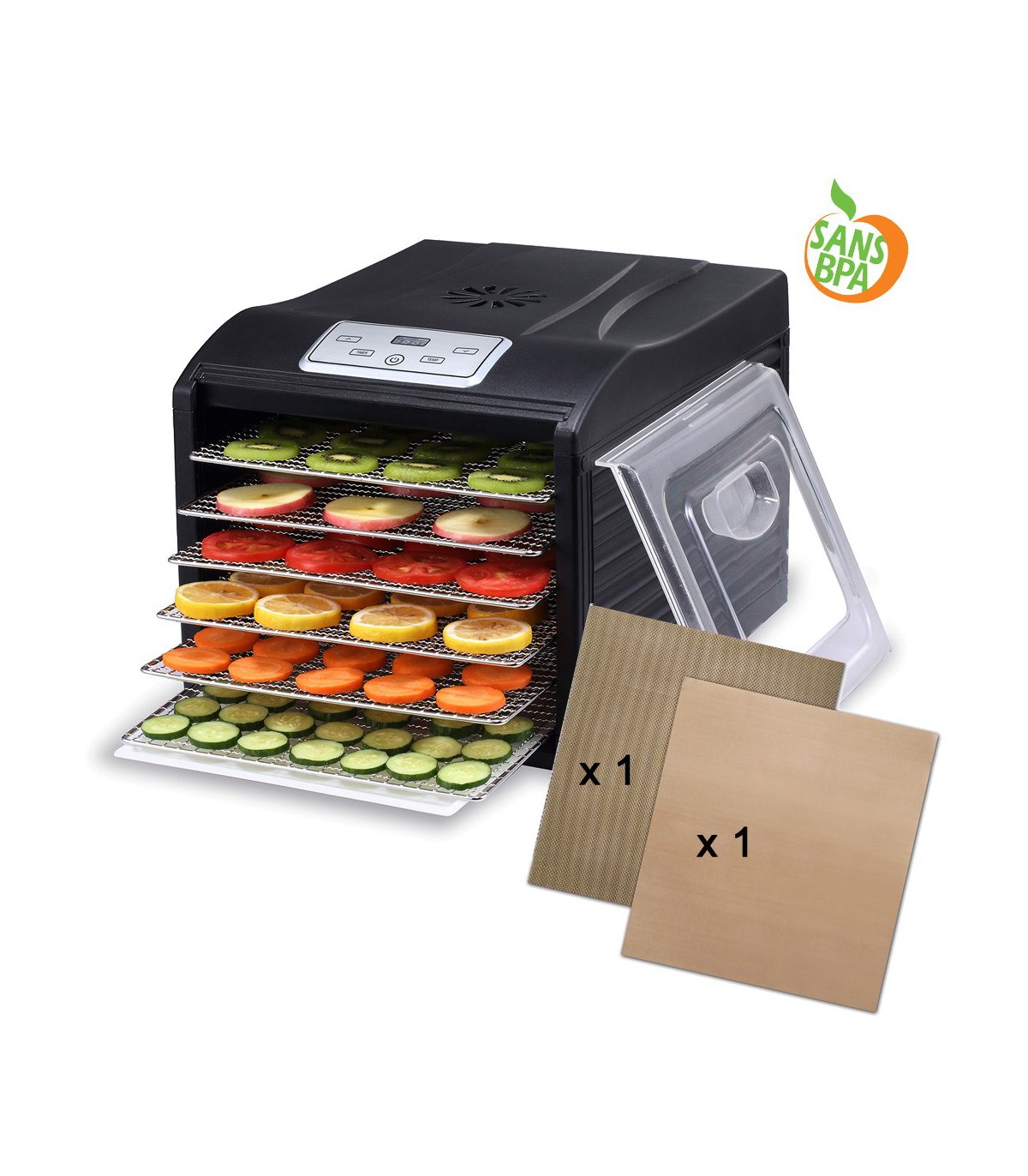 Minuterie de température séquentielle innovante à deux étages (TST) et technologie à double ventilateur pour un séchage facile et précis Séchage horizontal qui élimine le besoin de rotation des plateaux Déshydrateur Alimentaire BioChef Arizona 10 Plateaux - Blanc Appareil Pour Fruits Séchés Le NOUVEAU Déshydrateur alimentaire BioChef Savana propose des plateaux de séchage en acier inoxydable amovibles, une technologie à double ventilateur, une... Inclu avec le BioChef Savana: 6 Plateaux: 6 x Plateaux en acier inoxydable, 2 feuilles anti-adhérentes, 2 feuilles à mailles fines & 1 manuel d'instructions Le Savana crée des aliments séchés délicieux et précis en moins de temps et moins d'effort! Thermostat réglable 35º-70º Ce produit est conçu selon les normes européennes et est équipé d'une prise française qui s’adapte à toutes les prises murales standard. 9 Plateaux: 9 x Plateaux en acier inoxydable, 3 feuilles anti-adhérentes, 3 feuilles à mailles fines & 1 manuel d'instructions Une fois le séchage terminé, la minuterie de température séquentielle à deux étages active automatiquement le mode chaud, ce qui vous permet de conserver vos aliments déshydratés dans un état optimal. Option d'achat avec 6, 9 ou 12 plateaux en acier inoxydable Fabriqué à partir de matériaux résistants sans BPA Avec plusieurs modes de séchage prédéfinis, le BioChef Savana élargit votre créativité culinaire, vous permettant de déshydrater parfaitement les fruits, les légumes et les viandes avec des réglages adaptés pour des résultats optimaux 12 Plateaux: 12 x Plateaux en acier inoxydable, 4 feuilles anti-adhérentes, 4 feuilles à mailles fines & 1 manuel d'instructions 3 ans de Garantie, et Garantie 30 Jours Satisfait ou Remboursé - Service Client Français Choisissez le nombre de plateaux désiré en fonction de vos préparations (yaourt ou pain prennent plus de place) BioChef Savana - Deshidratador de alimentos, 2 Motores 500W (total