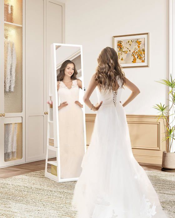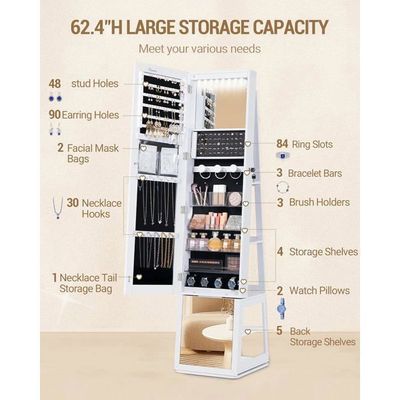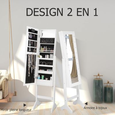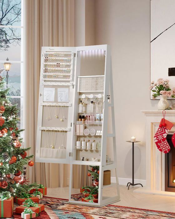 Elle est dotée de 3 étagères pour les montres et autres accessoires, des rainures pour les bagues et les boucles d'oreilles et des crochets en métal pour suspendre les bracelets et les colliers. Miroir LED 16 Lumières Rangement Bijoux Armoire à Bijoux Sur Pied Multi-rangement Avec Miroir LED MDF Effet Bois Vieilli Bois Blanc Design élégant 🪞【DESIGN ÉLÉGANT EN BOIS】Notre armoire à bijoux sur pied avec miroir apportera beaucoup d’élégance à votre décoration intérieure. Ce miroir à bijoux sur pied en bois avec 16 lumières LED est parfait pour choisir chaque jour le meilleur look, regarder tout le corps et garder à portée de main vos bijoux et accessoires rangés et bien rangés 💍【MULTIFONCTION, ARMOIRE À BIJOUX AVEC MIROIR】Notre miroir de dressing vous permet de ranger tous vos bijoux et accessoires de manière ordonnée : colliers, bagues, boucles d'oreilles, bracelets, montres, ornements pour les cheveux, etc. Cette armoire à bijoux en miroir vous aidera à choisir votre look en vous permettant de sélectionner plus facilement ce que vous préférerez au quotidien. Armoire à Bijoux sur Pied, Miroir Pleine Longueur, LED 3 Couleurs, Interrupteur Tactile, Porte... À l'intérieur de la porte, vous trouverez un compartiment pour les insérer et un bouton pour les allumer et les éteindre. 💡【16 LUMIÈRES LED】Ce miroir de sol moderne et élégant est doté de 16 lumières LED réparties sur tout le tour. ↙️【4 NIVEAUX D'INCLINAISON】Ce miroir sur pied peut adopter plusieurs positions. Armoire à Bijoux sur Pieds Mobile avec Miroir Psyché sans Cadre, Lumières LED et Miroir de Les lumières LED fonctionnent avec 3 piles AA (non incluses). Cette armoire à bijoux avec miroir est également un excellent choix comme cadeau pour quelqu'un de spécial.