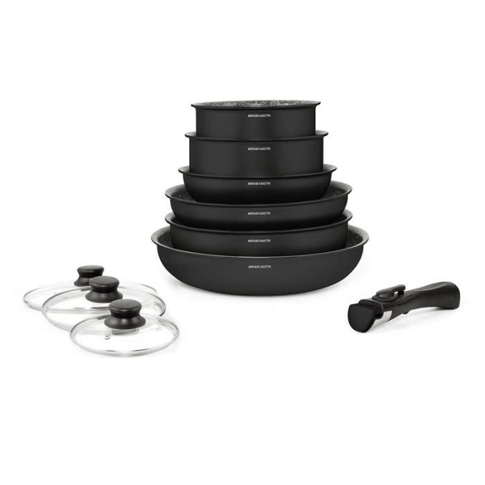 Les couvercles en verre permettent de surveiller la cuisson facilement, tandis que le bec verseur facilite le service des plats sans renversement. Batteries De Cuisine Arthur Martin Batterie De Cuisine 10 Pièces 3 Poêles + 2 Casseroles + 1 Ensemble Cuisine Complet Avec Couvercles Très pratiques à ranger grâce à la poignée amovible en bakélite, les poêles et casseroles Arthur Martin fonctionnent avec tous les feux dont induction et sont même compatibles avec votre four. Arthur artin A0025 Batterie de cuisine aovible 10 pièces Acier... Ensemble complet de 15 pièces en acier inoxydable ( sauf ustensiles) pour répondre à tous vos besoins culinaires : Cette batterie de cuisine comprend une variété d'ustensiles essentiels, tels que des poêles, des casseroles et des accessoires, offrant une solution complète pour la préparation de divers plats. De plus, cette surface facilite le nettoyage, rendant l'entretien de ces ustensiles rapide et efficace. Batterie De Cuisine Arthur Martin Am2493 8 Pieces - Acier Inoxydable... Modèle : AM5535 Contient 15 pièces : 3 casseroles, 2 poêles, 4 couvercles en verre, 5 ustensiles, 1 poignée amovible Matière : Acier inoxydable Intérieur : Miroir poli Couleur : Chrome Tous feux dont induction et four (sauf poignée) Poids : 6 kg Dimensions : Poêles : 24/26 cm Casseroles : 16/18/20 cm Couvercle en verre : 16/20/24/26 cm Caractéristiques : La Batterie de Cuisine AM5535 d'Arthur Martin est l'ensemble parfait pour équiper votre cuisine avec des ustensiles de qualité supérieure. Élégante couleur chrome pour ajouter une touche de modernité à votre cuisine : La couleur chrome donne à cette batterie de cuisine un aspect moderne et élégant, lui permettant de s'intégrer parfaitement dans n'importe quelle cuisine contemporaine, tout en ajoutant une touche de style et de sophistication. ARTHUR MARTIN - Batterie de Cuisine 4 Pièces en Aluminium Forgé Son design élégant, sa polyvalence et sa facilité d'utilisation en font un choix idéal pour les chefs amateurs et professionnels. Poignée ergonomique, couvercles en verre et bec verseur pour une manipulation sûre et pratique : La poignée ergonomique amovible assure une prise en main confortable et sécurisée, réduisant ainsi la fatigue lors de la manipulation des ustensiles.