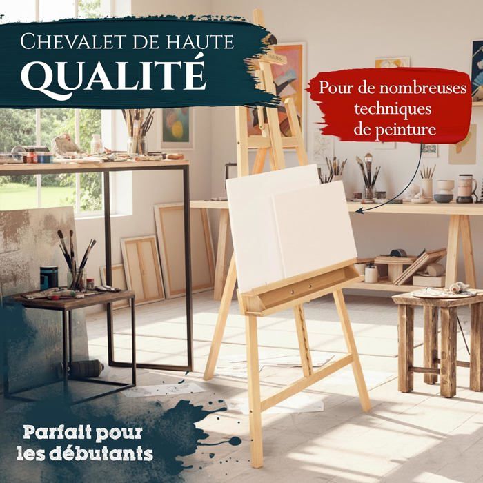 175cm Chevalet Chevalet en bois Chevalet d'atelier en pin Chevalet sur pied STABLEAU EN BOIS POLYVALENT EN DEUX TAILLES - 150CM & 175CM - Chevalet de haute qualité en bois de pin certifié FSC, disponible en deux tailles Montage Facile Notice Artina Chevalet Bois Grand Pin - FSC® 175cm Reglable En Hauteur - Châssis Grands & Petits - Pour Enfants & Adults - Mariage - Toiles Chevalet Mariage Exposition Déco 𝐒𝐓𝐀𝐁𝐋𝐄𝐀𝐔 𝐄𝐍 𝐁𝐎𝐈𝐒 𝐏𝐎𝐋𝐘𝐕𝐀𝐋𝐄𝐍𝐓 𝐄𝐍 𝐃𝐄𝐔𝐗 𝐓𝐀𝐈𝐋𝐋𝐄𝐒 - 𝟏𝟓𝟎𝐂𝐌 & 𝟏𝟕𝟓𝐂𝐌 - Chevalet de haute qualité en bois de pin certifié FSC, disponible en deux tailles. 𝐂𝐎𝐍𝐒𝐓𝐑𝐔𝐂𝐓𝐈𝐎𝐍 𝐓𝐑𝐈𝐀𝐍𝐆𝐔𝐋𝐀𝐈𝐑𝐄 𝐒𝐓𝐀𝐁𝐋𝐄 - 𝐒𝐓𝐀𝐁𝐋𝐄 𝐒Û𝐑 𝐏𝐎𝐔𝐑 𝐓𝐎𝐔𝐓𝐄𝐒 𝐋𝐄𝐒 𝐔𝐓𝐈𝐋𝐈𝐒𝐀𝐓𝐈𝐎𝐍𝐒 - La forme triangulaire du grand chevalet en bois assure une stabilité maximale. Chevalet de table en pin certifié FSC, chevalet pliable, 24 x 3,5 x 50... Convient pour des toiles jusqu'à 110 cm (modèle 150 cm) ou jusqu'à 125 cm (modèle 175 cm). 𝐌𝐎𝐍𝐓𝐀𝐆𝐄 𝐅𝐀𝐂𝐈𝐋𝐄 𝐀𝐕𝐄𝐂 𝐈𝐍𝐒𝐓𝐑𝐔𝐂𝐓𝐈𝐎𝐍 - 𝐅𝐋𝐄𝐗𝐈𝐁𝐋𝐄 𝐄𝐍 𝐀𝐍𝐆𝐋𝐄 - Le chevalet en bois est livré en kit avec une notice de montage et est rapidement prêt à l'emploi. 𝐔𝐓𝐈𝐋𝐈𝐒𝐀𝐓𝐈𝐎𝐍𝐒 𝐃𝐈𝐕𝐄𝐑𝐒𝐄𝐒 - 𝐏𝐎𝐔𝐑 𝐋𝐀 𝐏𝐄𝐈𝐍𝐓𝐔𝐑𝐄, 𝐋𝐄𝐒 𝐏𝐑É𝐒𝐄𝐍𝐓𝐀𝐓𝐈𝐎𝐍𝐒 𝐄𝐓 𝐋𝐀 𝐃É𝐂𝐎𝐑𝐀𝐓𝐈𝐎𝐍 - Que ce soit comme chevalet de peinture en bois, chevalet de mariage, support de tableaux lors d'expositions ou support de décoration lors de fêtes, ce chevalet est fonctionnel, robuste et visuellement attrayant. L'angle du repose-jambes arrière est réglable - parfait pour un travail confortable et personnalisé à l'atelier ou à la maison.