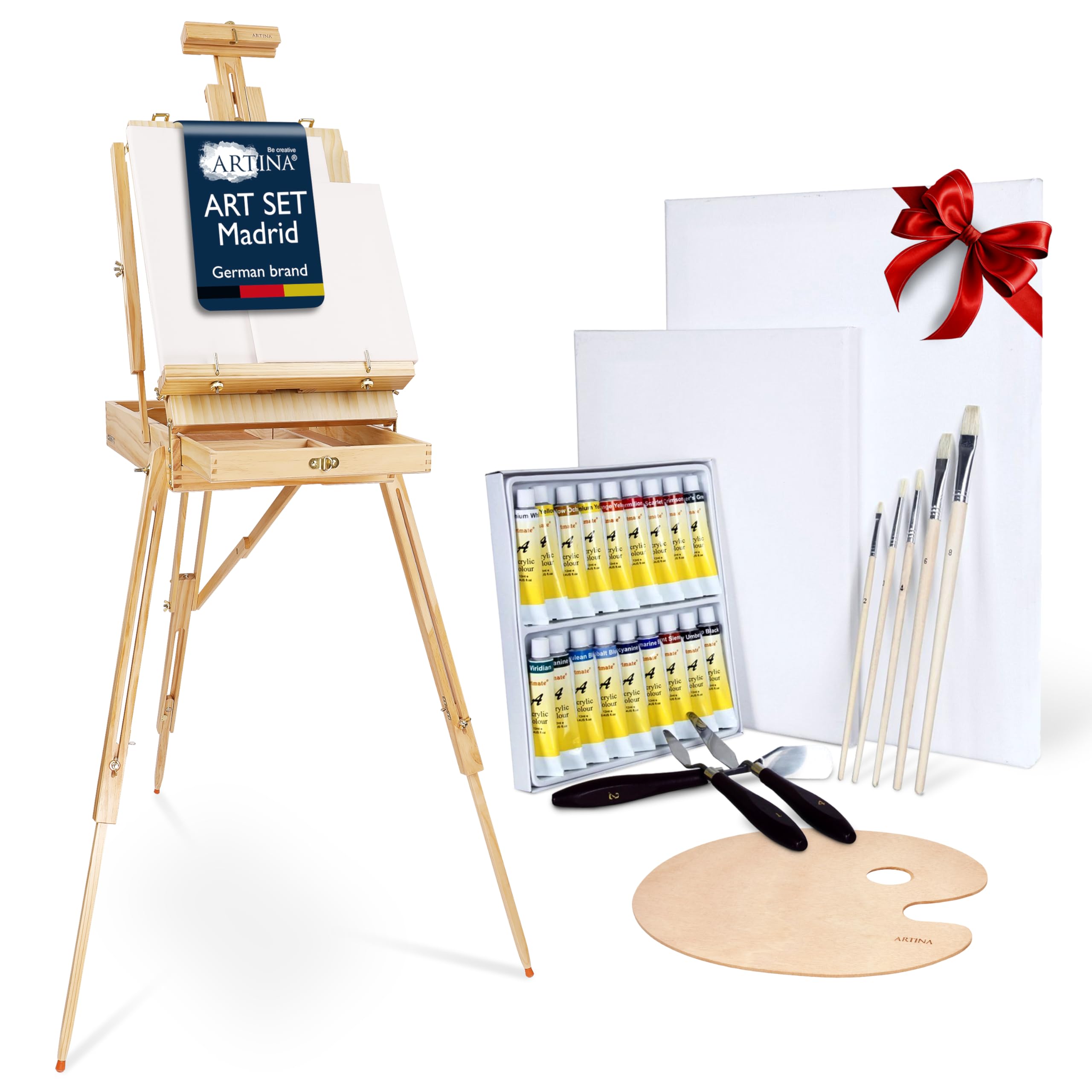 Peinture Gouache Artina Michelangelo Kit XXL Avec Chevalet 122pcs - Grand Set Peinture Acrylique, Crayons, Toile, Pinceaux, Aquarelles, Craies Pastels - Pour Tout Âge Palette Aquarelle Palette de peinture professionnelle, palette de peinture antiadhésive Grâce au trou large pour le pouce, vous tenez facilement la légère palette et ne fatiguez pas vos bras. Un accessoire pratique pour élèves et peintres Poids... Une palette de mélange vous offre la possibilité de tenir celle-ci pendant la peinture d'une seule main. Que ce soit pour la peinture à l'huile ou pour la peinture acrylique : Une palette de mélange est extrêmement utile pour mélanger les couleurs Caractéristiques du produit: - Marque : Artina - Contenu : 2 pièces - Dimensions : 23,5cm x 17cm - Matériau : Plastique. LOT DE PALETTE DE MÈLANGE - Vous n'aurez jamais assez d'une palette de mélange pour laisser libre cours à votre créativité. La palette plastique convient aussi bien aux débutants qu'aux utilisateurs avancés. PALETTE DE MÉLANGE EN PLASTIQUE - Les palettes de mélange en plastique sont particulièrement faciles à nettoyer et peuvent donc être utilisées encore et encore. AVEC 10 PUITS DE MÈLANGE - 10 puits pratiques pour les peintures, de sorte que vous puissiez mélanger une ou plusieur couleur directement à l'aide d'un couteau à peinture ou d'un pinceau. Grandes palettes de peinture ovales avec ouverture pour le pouce 23., 5cm x 17cm. Artina Artina est une marque de bijoux qui propose des créations originales et raffinées. Ses bijoux sont faits à la main avec des matériaux de qualité et sont disponibles en or, argent et platine