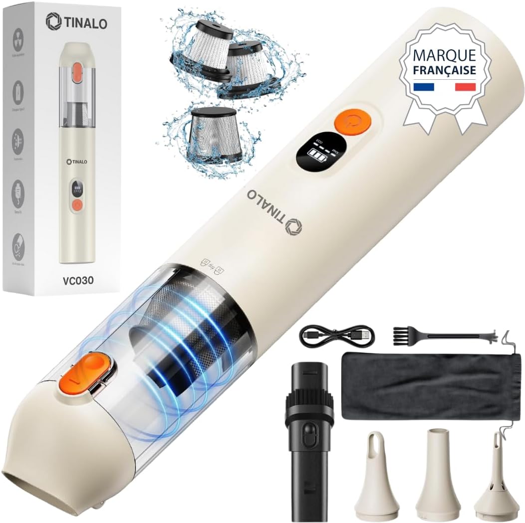 Miiepls Aspirateur à Main, 8500 Pa sans Fil, 120 W, Puissance D'Aspiration avec LumièRe LED 【Moteur sans balais amélioré】Moteur sans balais amélioré avec une puissance d'aspiration allant jusqu'à 17000PA, équivalente à deux fois la puissance d'aspiration des aspirateurs à main ordinaires, peut vous aider à effectuer un nettoyage complet. Aspirateur Main Boulanger Aspirateur ORFELD H20A : Aspirateur Balai, 17000pa Aspirateur Sans Fil, 2 En 1 Aspirateur Avec 2 Vitesses Modurable Batterie Amovible Technologie Cyclonique Filtre Hepa Hypoallergenique Blanc Aspirateur Léger Avec Filtre HEPA Lavable Appuyez sur la touche pendant 3 secondes pour démarrer cet aspirateur portatif sans fil. Découvrez la liberté du nettoyage avec l'aspirateur à main sans fil Linterngo. Pesant seulement 440g, cet appareil compact offre une puissance d'aspiration impressionnante de 17000PA grâce à son moteur sans balais amélioré. Idéal pour éliminer PUISSANCE D'ASPIRATION DE 17000PA : Équipé d'un moteur sans balais (brushless) haute performance et d'un filtre HEPA, cet aspirateur à main Nettlife élimine sans effort la poussière, les miettes, le sable et les poils d'animaux. Il pénètre en profondeur dans les tissus, matelas et fentes, idéal pour un nettoyage complet de l'intérieur de votre voiture ou de la maison. BATTERIE... La polyvalence et la flexibilité de cet aspirateur sans fil en font un complément idéal à votre vie quotidienne. 【4 en 1 Mini aspirateur】Ce petit aspirateur est de petite taille et facile à transporter. Le voyant de charge se trouve sur le connecteur, lorsqu'il est complètement chargé, le voyant de charge passera du rouge au vert (veuillez ne pas l'utiliser pendant la charge pour éviter tout danger) La conception sans fil vous permet de vous affranchir du cordon d'alimentation et vous donne plus de liberté et de flexibilité dans votre processus de nettoyage. Doté d'une variété d'accessoires avec des fonctions de soufflage, d'aspiration et de dépoussiérage, la fonction de pompage de l'aspirateur à main peut être utilisée pour comprimer le sac de rangement, ce qui permet d'économiser de l'espace de stockage. 【Aspirateur à main】L'aspirateur à main sans fil ne pèse que 440g.