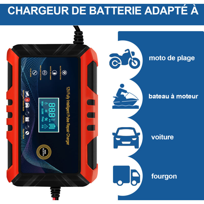 - Tension d'entrée : 220V. Chargeur De Batterie Voiture Chargeur Batterie Voiture 40A 12V/24V Chargeur de batterie de voiture : protection contre les surintensités, protection contre les courts-circuits, protection contre l'inversion de , protection contre les surchauffes, protection contre les surtensions et protection contre les basses tensions, chargeur de batterie de Bosster De Batterie Voiture Chargeur De Batterie Auto Intelligent, Ultrixe, Chargeur Batterie Mainteneur Et Automatique Reparation Fonction Portable Avec Ecran Lcd Pour Lithium Plomb Acide Lifepo4 Rouge Noir 83170896 Chargeur Automatique 35-200Ah -Informations sur produit : Chargeur de voiture Remarque : Cet article est avec un chargeur de batterie américain. - Champ d'application : 35AH-200AH. NWOUIIAY Chargeur de Batterie Voiture Intelligent 6A/12V Fonction de... Chargeur de batterie de : avec de réparation d'impulsions, adapté à tous les types de (sauf batterie au lithium), chargeur de batterie de Chargeur de batterie de voiture 12V 24V Remarque : cet article est avec 220 V, veuillez confirmer la tension de votre région d'acheter KAEFUYS Chargeur de Batterie de Voiture 12 V 12 A Chargeur de Batterie... Chargeur de batterie de voiture Convient pour SUV, et voiture. Chargeur de batterie de Sélectionne automatiquement la tension de charge appropriée à la température sans adaptation. Chargeur de batterie de : peut , la tension, la capacité batterie, chargeur de batterie du des packages 1 x chargeur 2 x clipsCaractéristiques - tension de sortie : 3,9-29,6 V 12 V 24 V chargeur de batterie de voiture. Chargeur de batterie automatique : sélectionne automatiquement la tension de charge appropriée à la température sans adaptation, chargeur de batterie de