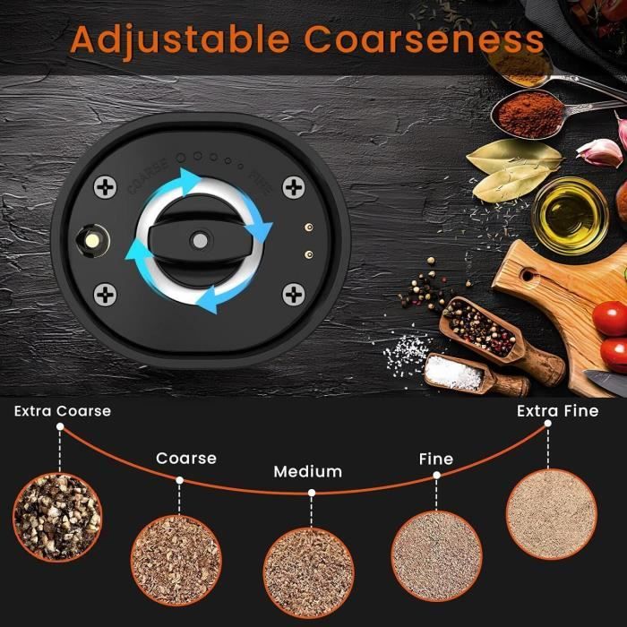 【5 niveaux de grossièreté réglables】 Il y a un bouton au bas du moulin à sel rechargeable. RIGHTWELL Moulin a Poivre Electrique, 2 Pcs... Appuyez et maintenez le bouton pour démarrer le moulin à sel électrique, et le voyant lumineux inférieur s'allume. Base de rangement et brosse de nettoyage Avec une base de rangement, il est pratique de stocker le sel et le poivre après utilisation. Moulin électrique Avec Base De Rangement Moulin à Poivre Automatique : Ensemble De Moulins à Sel Et à Poivre Moulin à épices Céramique Pour Barbecue Facile à utiliser : après avoir installé 4 piles alcalines AAA (non incluses), tournez dans le sens contraire des aiguilles d'une montre pour ouvrir le couvercle latéral, ajoutez une quantité appropriée de poivre ou de sel de rose, et tournez dans le sens des aiguilles d'une montre pour fermer le couvercle. Couvercle transparent Tournez dans le sens contraire des aiguilles d'une montre pour ouvrir le couvercle, puis ajoutez des épices au moulin à poivre. Lorsque vous utilisez ce moulin à poivre, vous pouvez régler la grossièreté du broyage en tournant le bouton pour répondre à vos besoins pour différents assaisonnements Nous avons fourni une brosse de nettoyage pour vous, vous pouvez l'utiliser pour nettoyer les résidus et les taches du moulin à sel et poivre électrique Large utilisation : le moulin à poivre électrique peut être utilisé pour moudre du poivre noir, du poivre blanc, du sel rose, du sel casher, du piment séché, etc. Noyau en céramique Cet ensemble de moulins à sel et à poivre électriques est construit dans un noyau de broyage en céramique de qualité supérieure, qui a une haute dureté, une résistance à l'usure et une longue durée de vie. Broyage automatique : par rapport aux moulins à sel et à poivre traditionnels, ce moulin à poivre électrique ne nécessite pas de broyage manuel du poivre. Set De Moulin À Poivre Et À Sel En Bois D'Acacia - Salières Et... La capacité est de 70 ml, et l'ajout d'épices une fois peut durer longtemps. Si vous avez des questions sur nos moulins à poivre, n'hésitez pas à nous contacter, et nous vous donnerons une réponse satisfaisante dans les 24 heures 2 pcs Moulin à poivre électrique automatique, à fonctionnement