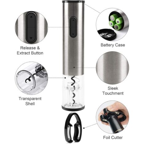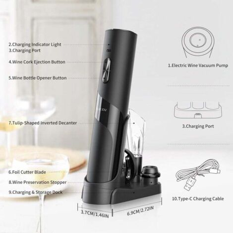Dans le cas où vous ne seriez pas satisfait de votre achat, rendez-la et nous vous rembourserons le prix complet., ✅ Vin Fresco Electric Tire-bouchon électrique Automatique Rechargeable Avec USB, Kit 5 En 1 Corps Plastique Alimentaire L'ouvre-bouteille électrique idéal pour tous les amateurs de vin qui veulent un outil puissant et confortable à leur disposition pour se débarrasser de la tâche des désagréments et des difficultés d'une bouteille fermée. Facilitez les moments conviviaux avec ce tire-bouchon électrique pour entreprise. Rechargeable. Avec câble de charge Dans ce but, sa spirale tourne premièrement en sens horaire pour enlever le bouchon et après en sens anti-horaire pour le libérer. 🕶【 ÉLÉGANT 】→ Nous prenons soin que, moyennant une manufacture avec une grande attention au détail, la finition de nos ouvre-bouteilles soit à la hauteur de son fonctionnement. Un Outil Multifonction pour Tous Vos Besoins 1. Tire-bouchon automatique sans boutons : Grâce à sa technologie avancée, ce tire-bouchon détecte automatiquement la présence d'un bouchon et l'extrait sans effort. Rechargeable sur sa base, il peut ouvrir jusqu'à 30 bouteilles sans nécessiter de recharge. Fonctionne avec bouchon en liège et en synthétique. 2. Pompe à vide d'air... ⚡【 RAPIDE 】→ Notre tire-bouchon offre des débouchages en temps record : ne plus que 8 secondes. 📋【 CARACTÉRISTIQUES CLÉS】→ Tire-bouchon automatique avec corps en plastique de qualité alimentaire et lames et spirale métalliques. De surfaces en noir matte, des textures homogènes et une excellente prise en main rendont nos ouvre-bouteilles d’excellentes ustensiles tant pour le professionnel que pour l’amateur du vin., 🍷 Coffret Electrique Tire-bouchon électrique Climadiff - Cuivre Rosé Alimenté par piles AA., Hauteur : 24 cm., Diamètre : 5 cm., 📐 ✅【 GARANTIE DE SATISFACTION 】→ Si vous cherchez une garantie de qualité et le meilleur service, choisissez EUROXANTY.
