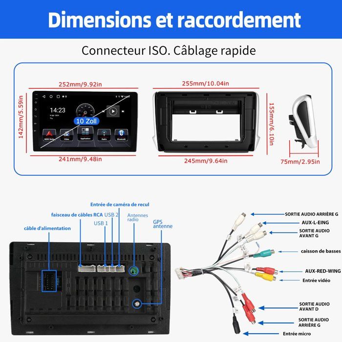 Combinée à Mirror Link et à l'affichage en écran partagé, elle vous permet de visualiser simultanément la navigation et les images de la caméra arrière, rendant chaque trajet plus intelligent et plus pratique Carplay 208 Autoradio Android 15 4 Core 64 G Pour Peugeot 2008 208 2012-2018 Avec Carplay Sans Fil Android Auto 5G WiFi Navi GPS, 10,1 Pouces Avec Mirror Link Bluetooth FM/RDS Radio EQ/USB/SWC Caméra écran Tactile Incell Caméra Recul Une fois connecté, accédez à la navigation, aux appels, aux messages et à la musique directement sur l'autoradio, tout en gardant les mains sur le volant. Aazon.co: (anual A/C) Roinvou 2 64G Android 13 CarPlay Stereo for... L'interface utilisateur conviviale prend en charge la fonctionnalité d'écran partagé, vous permettant d'effectuer plusieurs tâches simultanément avec la navigation et la musique. La compatibilité avec les commandes au volant (SWC) ajoute une touche de commodité pour une conduite en toute sécurité Android 15 Autoradio pour Peugeot 208/2008 2012-2018, 4 Cœurs/4G 64G] Utilisant le dernier système d'exploitation Android 15 et le système à 4 cœurs... Audio Améliorés et Personnalisation : Affinez votre expérience d'écoute grâce aux réglages d'égalisation et à la radio FM/RDS, qui garantissent un son cristallin et un accès facile à vos stations préférées. La prise en charge de Mirror Link filaire + sans fil garantit la compatibilité avec une large gamme de smartphones Sécurité et Commodité : Radio Android pour Peugeot 2008 est équipée d'une caméra arrière. Auto A/C) Roinvou 2+64G Android CarPlay Stereo for 2008 Performances et Stockage Puissants : Carplay voiture pour Peugeot 208 équipé d'Android 15, d'un processeur 4 cœurs, de 4 Go de RAM et de 64 Go de stockage, cet autoradio offre des performances rapides et stables. Elle offre une vue claire et grand angle pour un stationnement et une marche arrière plus sûrs.