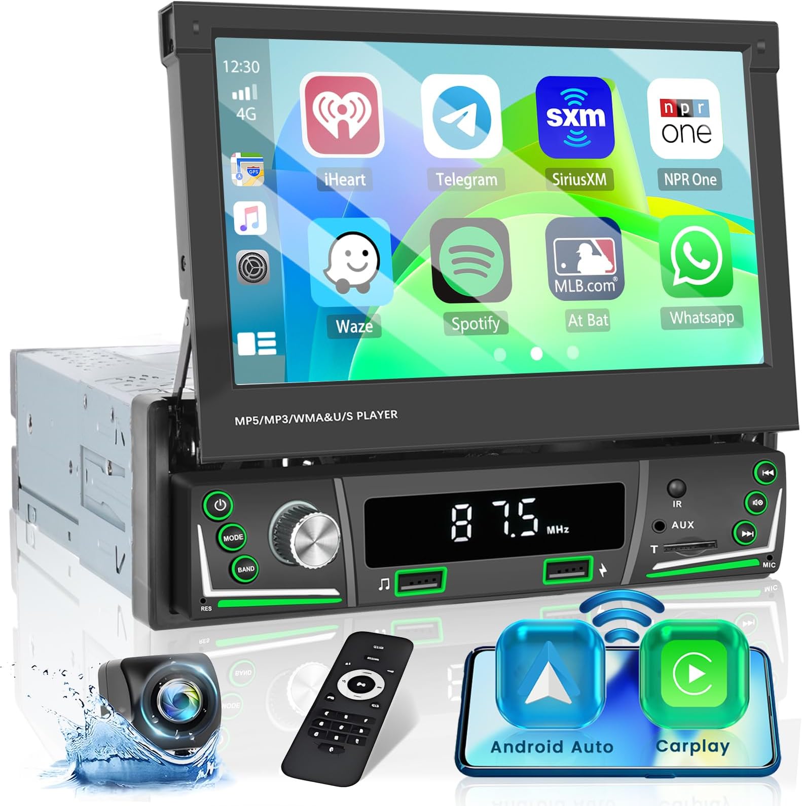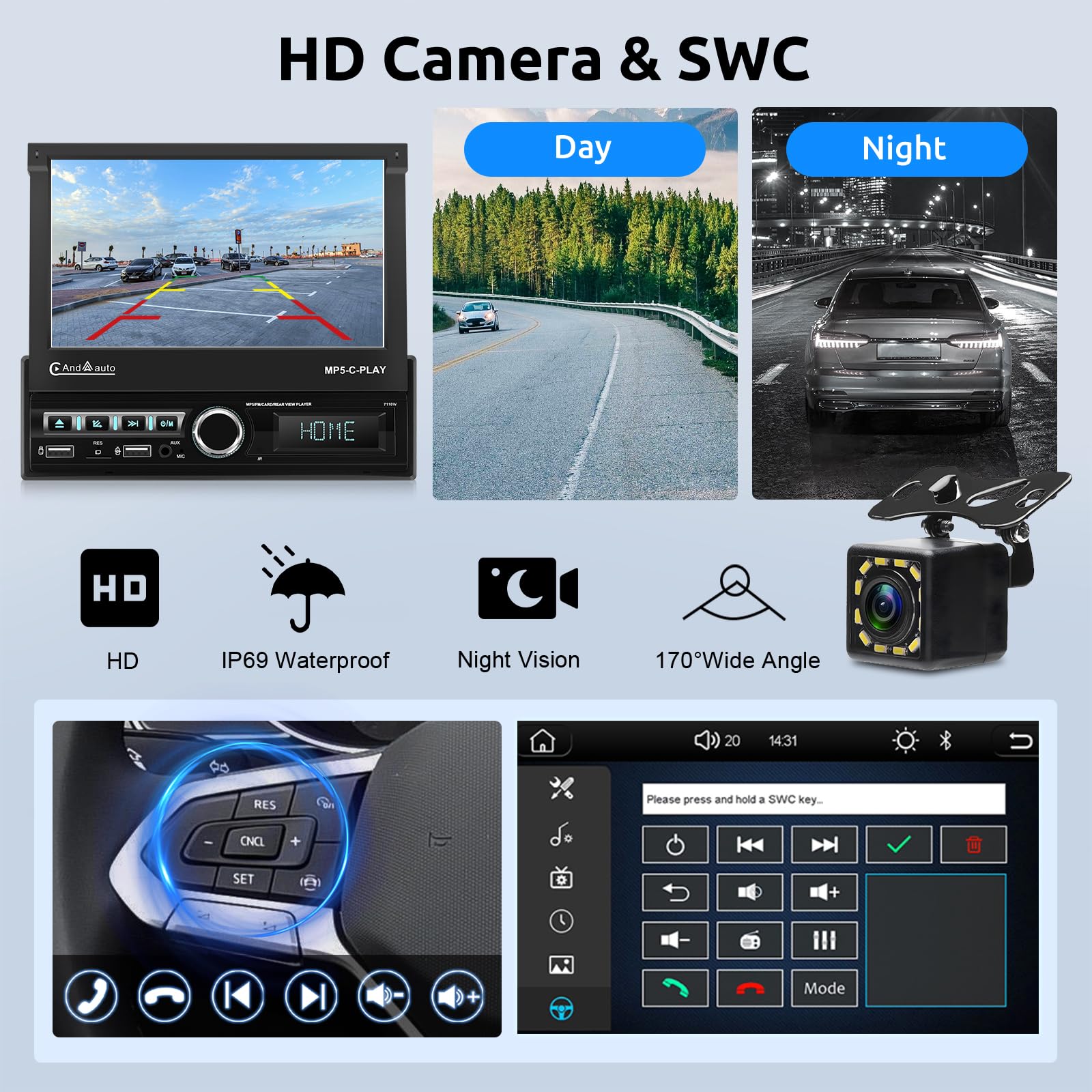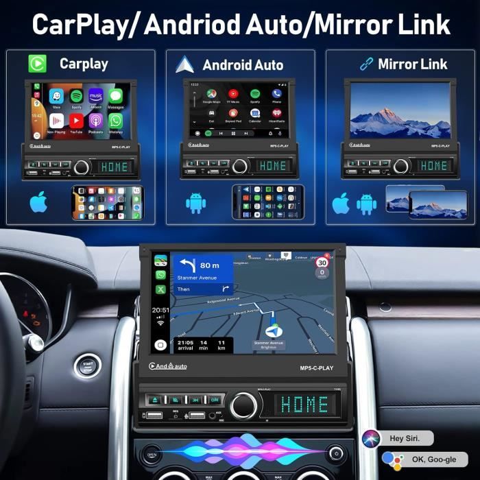 La caméra HD haute définition est étanche IP68, offrant une vue claire de jour comme de nuit, par beau temps comme par mauvais temps. Lorsque l'écran tactile est rétracté, vous pouvez rechercher des stations de radio, régler le volume et passer des pistes à l'aide des boutons rotatifs situés en bas. Autoradio Tactile Retractable 1 Din Autoradio Bluetooth Carplay Android Auto Sans Fil, Retractable Écran Tactile 7 Pouces Post Caméra Recul 2 64G Android 13 Autoradio 1 Din,7 Pouces Rétractable Écran Tactile... Une fois connecté à votre téléphone portable, vous pouvez non seulement accéder à vos appels, e-mails, messages, musique en ligne, cartes et navigation, mais aussi activer des assistants vocaux comme Siri pour des appels mains libres ou une navigation à guidage vocal., 3., Radio FM et Bluetooth : Cet autoradio Bluetooth prend en charge la connectivité Bluetooth avec les téléphones portables, permettant ainsi l'accès aux contacts, les appels mains libres, l'écoute de musique en ligne, et bien plus encore. 1 Carplay & Android Auto 2 Mirror link Il prend en charge une entrée AUX, une double charge rapide USB/Type-C et est compatible avec différents types de clés USB. Dimensions d'installation et service client : Les dimensions d'installation de cet autoradio à écran tactile 1din 7 pouces sont : 178(L)*50(H)*185(L)mm / 7,01(L)*1,97(H)*7,28(L) pouces ; Si vous n'êtes pas sûr qu'il soit adapté à votre voiture ou si vous rencontrez des problèmes, nous disposons d'un service avant-vente/après-vente parfait. La radio FM prend en charge la recherche de stations. L'écran tactile IPS de 7 pouces est rabattable et dépliable. Le câble de déclenchement de la caméra se connecte au feu de recul, activant automatiquement l'écran de recul en marche arrière. Après le câblage, apprenez les boutons dans les paramètres et vous pourrez utiliser le volant d'origine de la voiture pour contrôler Caméra de recul HD et DVR: cet autoradio 1 din intégre une caméra de recul HD étanche avec vision nocturne. En mode arrière, elle affiche automatiquement l'image sur l'écran, améliorant la visibilité pour un stationnement nocturne sécurisé et facile Jusqu'à 18 stations peuvent être préréglées., 4., Caméra de recul et commandes au volant : L'autoradio avec caméra prend en charge la vision nocturne infrarouge. Le câble auxiliaire de marche arrière permet la commutation manuelle. Les boutons sont équipés de lumières colorées qui peuvent être réglées librement pour ajouter des couleurs à la mode à l'intérieur du véhicule. Autoradio 7 Écran Rétractable Bluetooth CarPlay Android Auto FM USB SD, ecran vo