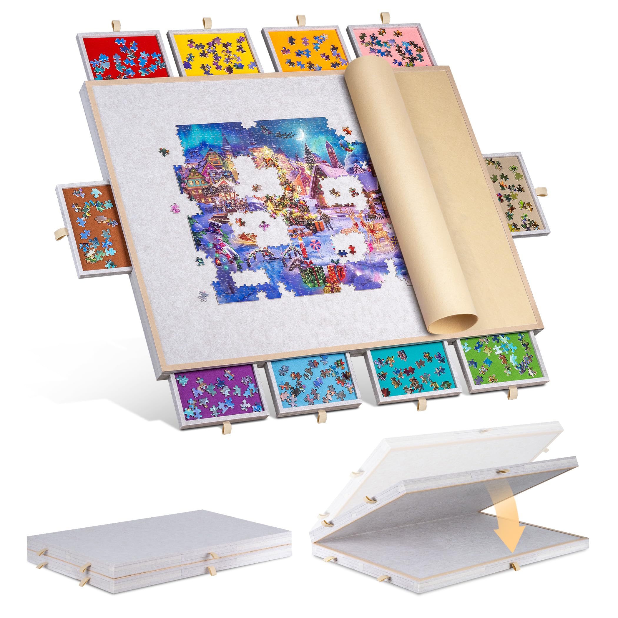 Becko US Plateau de puzzle avec support réglable et 4 tiroirs à puzzle – Table de puzzle carrée Le revêtement en feutre le rend également plus durable et plus facile à ranger que les motifs en bois pur. Support Rangement Puzzle Avec Housse Planche De Puzzle Réglable Avec 4 Tiroirs Et Couvercle - Table De Puzzle En Bois à Angle Planche Inclinable Le design unique dispose de 5 réglages d'angle et vous permet de l'installer à plat ou incliné pour un confort optimal, tout en réduisant considérablement la tension physique pendant des heures de jeu. 6 plateaux de rangement : conçus avec 6 plateaux colorés pour vous garantir une plus grande efficacité de jeu en triant les pièces de puzzle par couleur ou forme Lavievert Table de puzzle réglable en bois pour adultes, table... Rangement sans effort : le poids modéré offre un équilibre parfait, assurant une meilleure portabilité tout en conservant toutes les fonctionnalités. Peut contenir 1000 pièces – La surface utile mesure 76 × 51 cm, idéal pour la plupart des jeux de puzzle de 1000 pièces. C'est un cadeau d'anniversaire ou de vacances idéal pour les adolescents, les personnes âgées ou les fans de puzzle de tous âges. Planche de puzzle réglable à angle : fabriquée avec des panneaux en pin de qualité supérieure, la planche de puzzle Lavievert offre une qualité exceptionnelle. C'est un assistant fiable que vous ayez du plaisir à jouer dans le salon, la chambre ou à l'extérieur. Description du produit Lavievert Planche de puzzle inclinable de 1000 pièces, table de puzzle réglable avec housse en feutre, planche de rangement pour puzzle avec 6 plateaux de tri colorés Avertissement De Sûreté Tenir à l'écart du feu