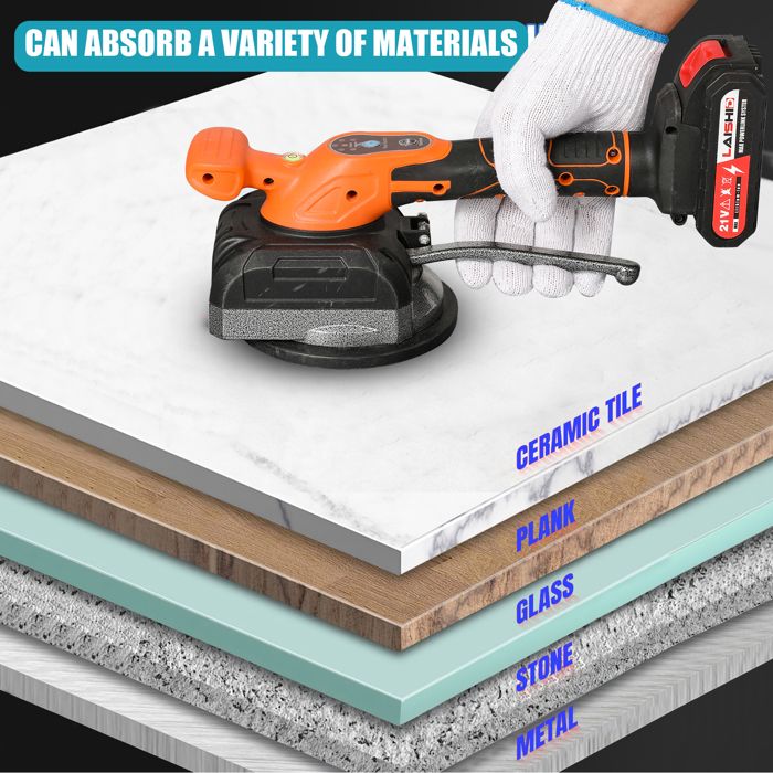 TMISHION extracteur de ventouse manuel Ventouse en verre en plastique Dimensions du produit : 30 x 13 x 15 cm. Kit Carrelage 2 Batteries Lithium Machine De Nivellement Vibrante Pour Carrelage 21V, Outil De Pose De Carrelage Avec 5 Vitesses Réglables, Grande Capacité De Charge, Ventouse élargie Avec Niveau à Bulle Intégré Nivellement Carrelage Sans Fil Fréquence de vibration : 1000 – 13500 tr/min Taille ventouse : 130 mm Champ d'application : 60-150 cm. Solved Appareil de Nivellement (10p)La machine de Kit de nivellement pour carrelage Solid 2mm – clips cales pince... Batterie rechargeable et polyvalence : alimenté par une batterie au lithium de 21 V de 1300 mAh et par différentes précautions de sécurité pour des performances de longue durée. Absorption améliorée : équipé d'une ventouse en caoutchouc haute résistance avec une large surface de contact jusqu'à 60 à 150 cm, ce qui garantit une prise ferme et stable sur des surfaces plates, lisses et non poreuses. Convient pour la pose de sols et de carrelage, ainsi que pour le travail du verre et des miroirs. Batterie : 2 pièces, batterie au lithium de 1300 mAh. Moteur puissant et vibration réglable : un moteur puissant produit des vibrations à haute fréquence qui améliorent l'efficacité du travail et obtiennent un effet de carrelage uniforme et plat. Spécifications: Tension d'entrée : 100-240 V.
