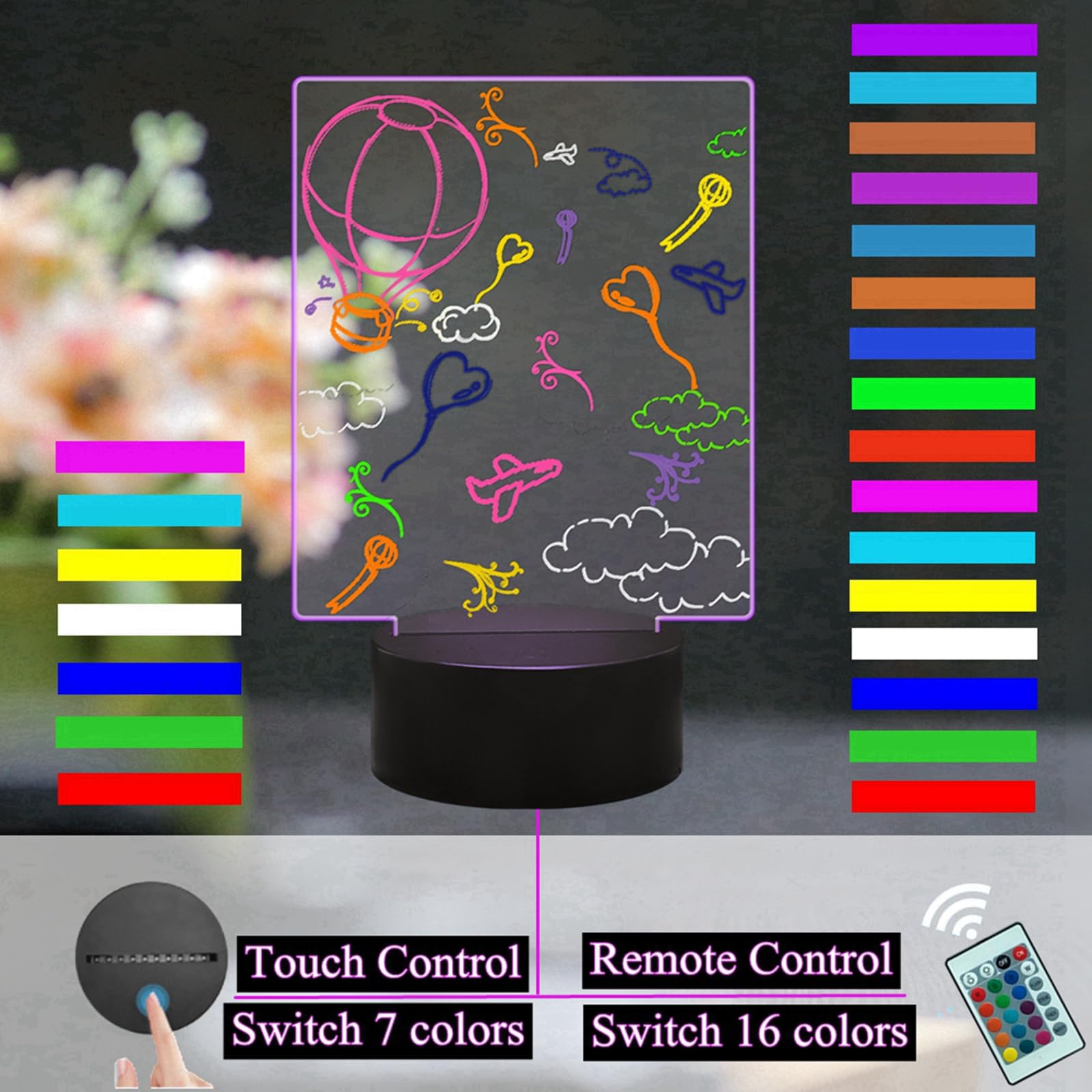 Tablette Dessin Lumineuse Planche à Dessin LED Rechargeable Avec 7 Stylos De Couleur Tablette à Dessin LED Enfants Tablette À Dessin LED | Tableau Effaçable À Sec En Acrylique Cikonielf Veilleuse pour enfants LED veilleuse USB Rechargeable lumière... * Facile à nettoyer : l'effacement à sec permet un nettoyage sans effort, que vous pouvez rapidement mettre à jour vos messages ou œuvres d'art sans aucun tracas ou . Dimensions : 21,4 x 21,4 x 4 cm., Couleur : transparent. Contenu de l'emballage : 1 planche à dessin pour enfants. *Utilisation polyvalente : conçu pour de multiples applications, ce tableau d'affichage en acrylique est adapté pour les dessins d'enfants, les rappels ou les affichages créatifs, améliorant à la fois les paramètres de la maison et du bureau. Options de couleurs vives : le tableau à message LED coloré en acrylique dispose d'une gamme de couleurs vives, parfait pour créer des messages et des dessins accrocheurs qui se démarquent dans n'importe quel environnement. [Support réglable] Cette planche comprend un support réglable, vous permettant de la positionner à votre angle préféré pour une visibilité optimale, qu'elle soit placée sur un bureau ou accrochée à un mur. [Ensemble complet] Ce produit est livré avec sept stylos colorés, offrant tout ce dont vous avez besoin pour libérer votre créativité et vous exprimer immédiatement. TABLEAU LED NOTE avec Couleur, Tableau Acrylique Effaçable à Sec avec 7...