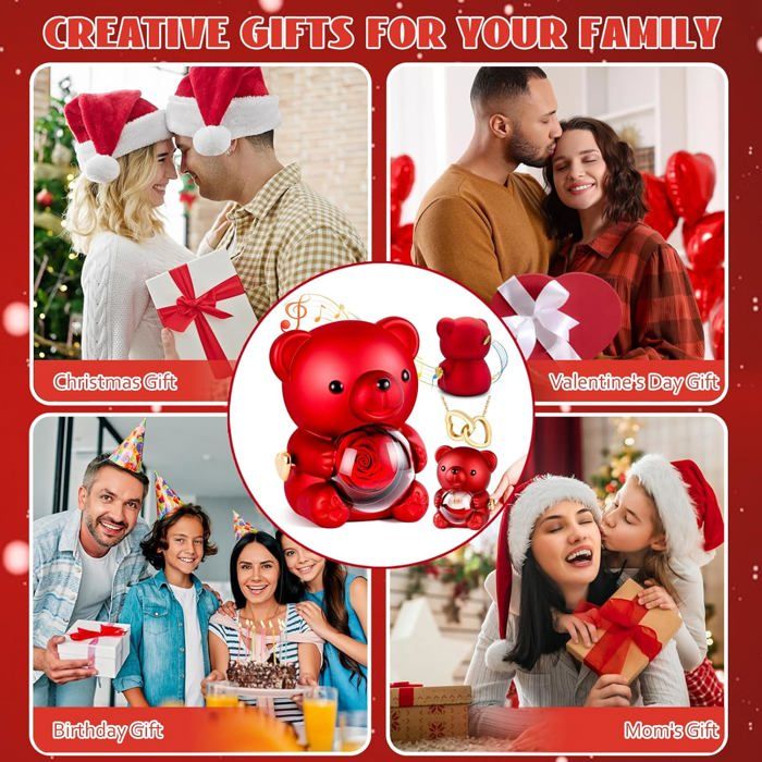 Il est doux et délicat, comme un câlin chaleureux, et donne un sentiment de sécurité Le collier est fabriqué à partir de matériaux de haute qualité et décoré de pierres précieuses qui donnent une texture élégante Pas de découpe ou d'arrosage nécessaire ; éviter la lumière directe du soleil et l'humidité Dimensions : 12 x 12 x 16 cm Contenu de l'emballage : 1 ours 1 rose 1 collier., 1 écharpe., 1 carte de vœux. Roses rouges en cristal avec boîte cadeau, roses éternelles, rose en... Bouton d'amour galvanisé : la boîte cadeau rose éternelle se distingue par son design unique rotatif à 360°. Le design a une signification profonde : la rose symbolise l'amour, l'ours protection et l'attachement La combinaison de ces deux symboles exprime la passion de l'amour et transmet la promesse de soins - une preuve d'amour parfaite La signification symbolique du collier est tout aussi profonde : elle incarne le rôle de protecteur et de compagnon dans l'amour Si vous portez la chaîne autour du cou, vous semblez que votre bien-aimé vous protège toujours et que vous ressentez la chaleur de l'amour partout Un cadeau plein de romantisme et de créativité : L'artisanat unique de véritables roses garantit que les fleurs ne fanent jamais et symbolisent l'amour éternel. Ours Rose éternelle Aloskart Ours Rose Eternelle Avec Bijoux Cachée, Cadeau Saint Valentin Pour Femme, Ourson Rose Eternel Avec Collier, Cadeau Anniversaire Femme, Cadeaux Noël Et Fête Des Mères Pour Maman Rose éternelle Ours Cette boîte cadeau reflète non seulement les vrais sentiments et l'ambiance romantique du destinataire, mais apporte également au destinataire des surprises inattendues et des moments spéciaux Le petit ours dans votre main embrasse une rose qui ne se fane jamais. Coffret cadeau de vacances : la rose fanée symbolise les sentiments éternels, l'ours symbolise l'attachement et la protection. Rose éternelle : grâce à une technologie de conservation unique, ces roses conservent durablement leur forme et leur couleur et ressemblent à celles fraîchement cueillies. Design multifonctionnel : les roses éternelles peuvent être placées sur une étagère ou une table dans la boîte cadeau, offrant une belle expérience visuelle. Le temps ne passe pas, et les amis proches seront toujours là pour vous. Le petit ours est magnifiquement formé et décoré de roses éternelles colorées qui diffusent romantisme et chaleur. Coffret Cadeau Avec Ours En Forme D'Ours Éternel - Boîte À Roses... Offrez-le à votre bien-aimé, rendez cette promesse avec une rose et laissez les petits ours vous accompagner tous les jours. Surprise romantique : cette élégante boîte cadeau rose convient aux femmes de tous âges et constitue le choix idéal pour les mères, les épouses, les petites amies, les grands-mères ou les sœurs. Boîte ronde de 26 roses éternelles dôme 3D 26cm