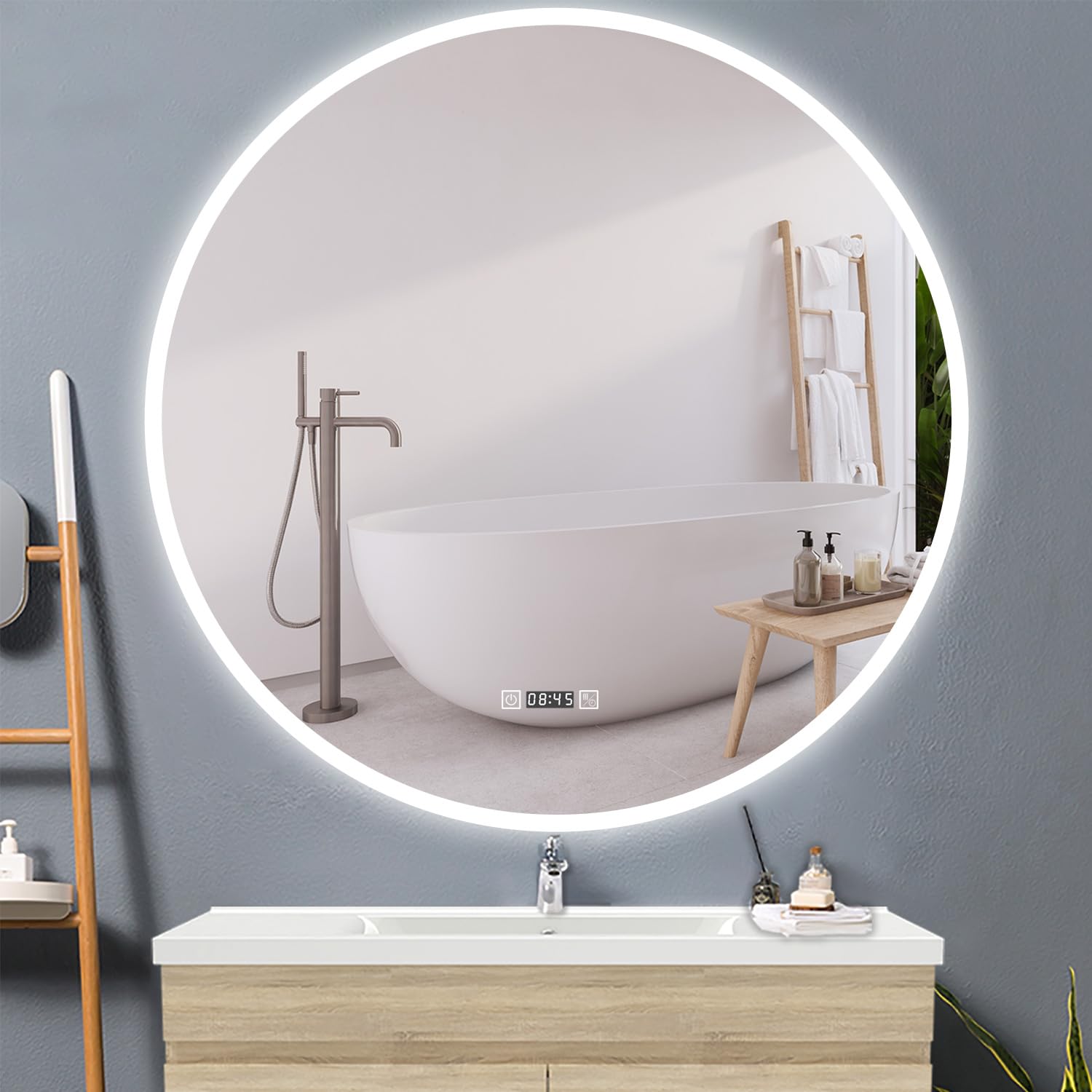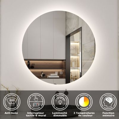 FONCTION ANTI-BUÉEUn dispositif chauffant placé derrière le verre permet de désembuer le miroir en quelques secondes. FONCTION RÉGLAGE MÉMOIREMémorisation automatique du dernier réglage. En cas d'incident, prenez des photos, refusez la livraison et inscrivez le motif précis sur le bon de livraison, puis contactez-nous. Il dispose également d’une fonction anti-buée. Miroir Salle de Bain LED Rétro-éclairé (6500K) - 90 - Commandes Une fonction utile et pratique qui apporte un réel confort d’utilisation. Ce miroir tactile rétro-éclairé offre la possibilité d'ajuster l’intensité lumineuse et la température d’éclairage. Miroir lumineux rond Diam.80 cm Modern, anti-buée, variateur intensité... Ce miroir rétro-éclairé dispose de 3 fonctions tactiles + la mémorisation du dernier réglage., 1., Intensité lumineuse réglable de faible à fort (jusqu'à 1600 lumens)., 2., Température d'éclairage 3 couleurs : blanc froid (6500 K), blanc neutre (5000 K) ou blanc chaud (3500 k)., 3., Fonction anti-buée. Le miroir lumineux rond VEKIO est équipé d’un verre haute définition de 5 mm d’épaisseur et d’un cadre en aluminium inoxydable. A réception, vérifiez en détail le colis et son contenu en présence du livreur. Miroir Lumière Chaude Froide AICA 80 Cm Miroir De Salle De Bain LED Rond Avec Cadre Noir, Tricolore + Anti-buée + Mémoire + Gradation Infinie AICA SANITAIRE | Bricomarché Miroir Lumineux Tactile Réglable Vekio miroir led rond ø80 cm de salle de bain fonctions anti-buée - couleur et intensité lumineuse réglables. Ce modèle existe en diamètre 60 et 80 cm. En cadeau : 1 miroir grossissant à ventouse ø8 cm est offert (inclus dans le carton). Le miroir lumineux rond vekio est équipé d'un verre haute définition de 5 mm d'épaisseur et d'un cadre en aluminium inoxydable (résistant à la... Miroir lumineux de salle de bain rond Ø 80 cm doté d'un éclairage LED jusqu'à 1600 lumens.