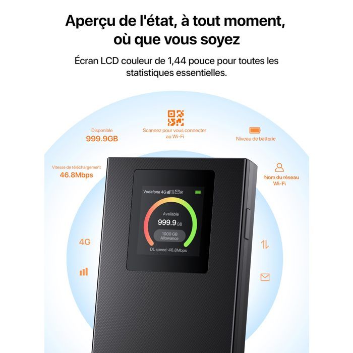 Le puissant module de réception de signal garantit l'effet de réception du signal de la carte SIM. Utilisez votre téléphone pour rechercher le nom et entrer ce mot de passe pour accéder directement au point d'accès wifi. La source d'alimentation usb - C est très pratique: il peut alimenter le routeur avec une source d'alimentation ou un chargeur pour un ordinateur portable ou un téléphone mobile. Connectez plusieurs appareils en même temps : le routeur mobile portable peut fournir des points d'accès wifi à 32 appareils en même temps, et dans les voyages en plein air ou en autocaravane, le routeur WiFi 6 fournit des réseaux wifi pour plusieurs personnes. Si le périphérique ne peut pas reconnaître automatiquement l'APN, cliquez sur Configuration - Option APN pour configurer et ajouter manuellement l'APN. Il peut également être connecté directement aux dispositifs câblés par l'intermédiaire d'un câble ethernet pour fournir un réseau câblé. Routeur 4g Avec Carte Sim Routeur WiFi Hotspot 4G Portable Avec Fente Pour Carte Sim Abs Blanc WiFi Portable Haute Vitesse Routeur WiFi 6 USB-C Voyage Routeur mobile WiFi 7 Nighthawk 5G M7 avec connectivité eSIM globale Il y a un nom et un mot de passe en bas du routeur. Module WiFi 6 mis à jour : le routeur sans fil ajoute un module d’assistance WiFi indépendant au module WiFi principal, ce qui rend le signal WiFi plus puissant et couvre jusqu’à 200 m² pour répondre facilement à vos besoins quotidiens. Il offre le choix parfait pour les sauvegardes Internet temporaires. Plusieurs options d'alimentation] Ce routeur Wi-Fi 6/UE prend en charge les cartes SIM 3G, 4G et 5G et dispose d'une interface USB-C moderne (l'appareil ne... Bande globale : les routeurs sans fil sont adaptés à toutes les cartes SIM plug-and-play en Europe, sans configuration nécessaire. 【2 ports Ethernet Gigabit】: le routeur wifi 6 comprend 2 ports Lan RJ45 pour une connexion filaire plus stable, ce qui le rend idéal pour les appareils ayant des exigences réseau particulières (par exemple: Smart TV ou PC). [spécifications] Nom: routeur sans fil portable WiFi 6 Matériel: plastique, électronique Chipset: MTK7628kn Fréquence principale : 580 MHz Interface du dispositif: 2 interfaces ethernet, 1 port d'alimentation type C Fente de carte: 1 fente de carte SIM nanométrique (à l'exclusion de la carte SIM) [Emballage] 1x Portable Routeur WiFi 6 1x USB C Câble d'alimentation 1x Manuel d'utilisation Insérez simplement une carte SIM (non fournie) et profitez d'un internet haut débit jusqu'à 300 Mbps. Il permet de connecter jusqu'à 10 appareils en même temps... 【Connectivité Multi - Appareils】: un routeur Sim mobile peut connecter simultanément 32 périphériques réseau tels que des téléphones portables, des tablettes, des projecteurs, etc. 【Plusieurs Options d'alimentation】 wifi 6 routeur 4G Sim alimenté par USB - C, peut être utilisé avec: Banque d'alimentation, chargeur de téléphone portable, port usb PC. C’est aussi simple que de charger un téléphone portable.