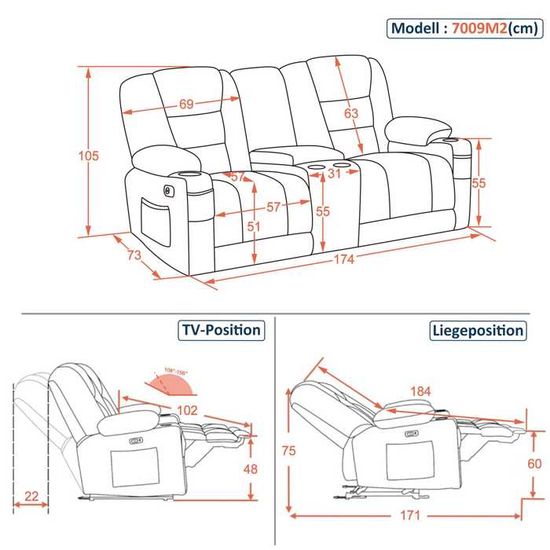 Rangement pratique : le canapé 2 places avec accoudoirs intégrés pour les collations et télécommande et porte-gobelet double, parfait pour les soirées cinéma ou les jours de jeu , Autres indications : 1., Ce canapé deux places est emballé en 4 colis ; 2., Veuillez nous contacter si vous avez des questions ou des suggestions Ensemble:composé un canapé 2 places + 2 fauteuils en cuir italien vachette candi Canape 2 Places M MCombo Canapé Avec Fonction Lit, Relax Canapé Avec Appui-tête Canapé 2 Places Relax électrique Le dossier, le repose-pieds et l'appui-tête reviennent à leur position initiale en 9 secondes Espace pour vos boissons, collations, télécommande, livres, etc. Le canapé 2 places offre des sièges réglables électriquement séparément, ajustez les positions selon vos préférences ; par exemple, l'un se penche en arrière, l'autre se tient droit, sans aucune interférence Le repose-jambes allongé assure un meilleur soutien. 1 Bouton Home 2 Repose-jambes prolongé 3 Appuie-tête réglable 4 Espace accoudoir 5 Porte-boissons Contrôle de siège indépendant : le canapé 2 places offre des sièges réglables électriquement séparément, ajustez les positions selon vos préférences ; par exemple, l'un s'incline vers l'arrière, l'autre est assis verticalement, complètement sans interférences Canapé relax électrique 2 places avec position cœur balance : ce canapé offre un grand confort grâce aux positions réglables de 116 ° à 155 ° ; soulève les jambes et soulage la tension de la colonne vertébrale ; parfait pour se détendre sur deux places ou soirées cinéma