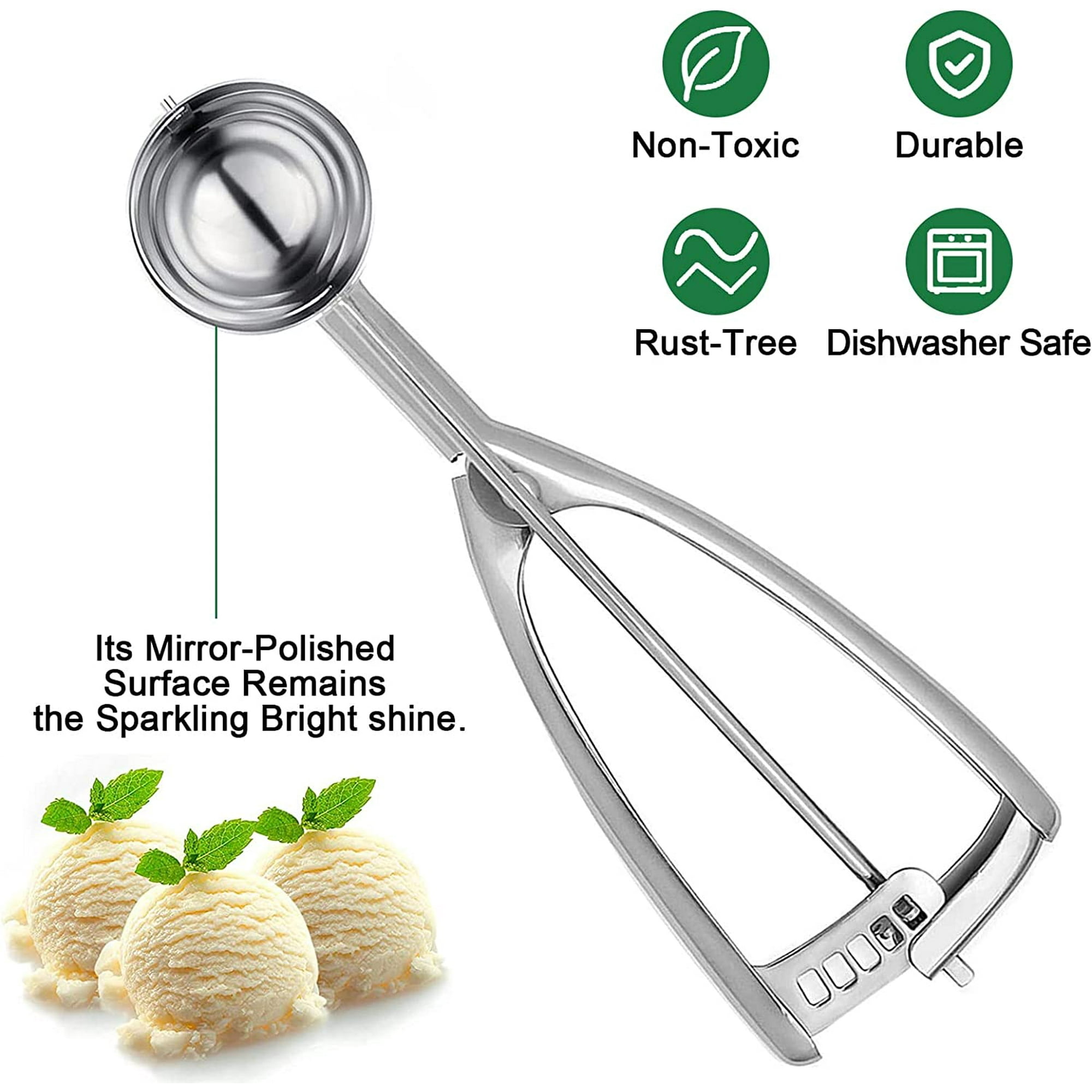 Accessoires Patisserie Cuillère à Crème Glacée Avec Gâchette Facile –2PCS Gâchette Pour Cuillère Portionneuse 5 Cm Pedrini Lillo Cuillère à Glace, Acier Inoxydable, Blanc-Acier, 230 x 73 Cuillère à crème glacée en acier inoxydable : L'acier inoxydable 304 ne rouille pas facilement et est facile à nettoyer d'un simple coup de chiffon... Cette cuillère à glace convient à la maison, au restaurant, lors de fêtes et chez les glaciers. Elle permet également de façonner divers plats ronds comme des boulettes de viande et des boulettes de fruits, pour une alimentation saine et facile. Facile à nettoyer, elle peut être lavée à la main ou en machine. Cette cuillère à glace est fabriquée en acier inoxydable 304 de qualité alimentaire avec un ressort renforcé pour une durabilité et une résistance à la corrosion optimales. La cuillère à glace a un diamètre de 5 cm et une capacité d'une cuillère à café (5 ml), ce qui permet de réaliser des biscuits et des pâtisseries uniformément ronds. Cette cuillère à glace est un cadeau idéal pour les enterrements de vie de jeune fille, les mariages, les anniversaires et bien plus encore. C'est également un cadeau pratique et attentionné pour la fête des Mères et autres fêtes. Son matériau en acier inoxydable de haute qualité prévient les taches disgracieuses et les rayures, et conserve son aspect impeccable au fil du temps. PRÉLEVAGE CONFORTABLE : Conçue avec un long manche ergonomique, cette cuillère permet une utilisation facile et sans effort