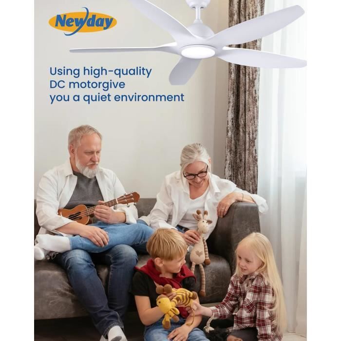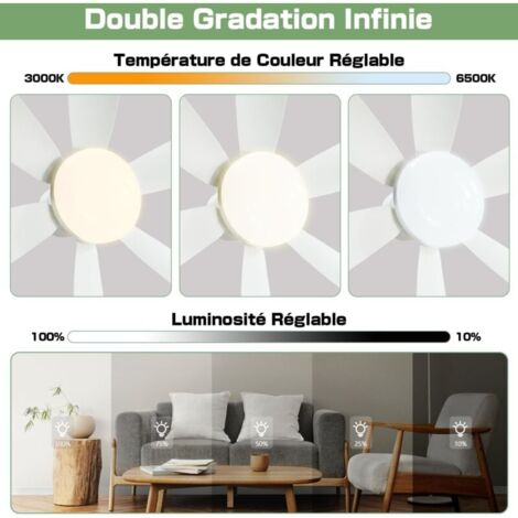 Ventilateur Pour Chambre Salon Générique Ventilateur Plafond Avec Lumière Et Telecommande, LED Telecommande Ventilateur Plafond Ce ventilateur de plafond blanc (46cm) combine une lampe LED 40W dimmable (2400 lumens, 3 températures de couleur) et une ventilation 3 vitesses. Contrôle par... Ventilateur de plafond moteur DC 46cm LED 44W CCT DIM Blanc La vitesse du ventilateur peut atteindre 400r/min, ce qui fournit un flux d'air puissant sans perturber le sommeil, ce qui est particulièrement adapté aux chambres d'enfants, aux chambres à coucher et à d'autres environnements qui nécessitent des niveaux élevés de silence. La lumière LED est dimmable (5% à 100%) et la température de couleur s'ajuste du chaud au froid (3000K à 6500K). Vous contrôlez le tout par télécommande ou... 【Télécommande intelligente】Ventilateur plafond avec lumiere est équipé d'une télécommande multifonctionnelle, qui peut régler à distance trois vitesses de vent, trois modes d'éclairage et une minuterie marche/arrêt (2 heures/4 heures), ce qui facilite le contrôle de l'air et de l'éclairage dans votre maison et améliore la qualité et la commodité de la vie. Il utilise une source lumineuse LED haute luminosité de 2400 lumens et prend en charge 3 réglages de température de couleur (lumière chaude/lumière naturelle/lumière blanche froide), ce qui permet de créer facilement une atmosphère confortable dans la maison et de répondre aux besoins de différents scénarios. 【Silent Copper Brushless Motor】Ventilateur plafond silencieux est équipé d'un moteur DC brushless en cuivre pur, qui fonctionne en douceur et produit un faible niveau sonore, presque silencieux. 【Trois fonctions en une】Ce ventilateur de plafond télécommandé avec lumière combine les fonctions d'éclairage, de ventilation et de décoration.