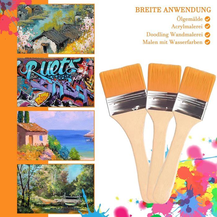 Van Bleiswijck Set de 3 pinceaux acryliques Plats pour Peinture à l'huile Conviennent également comme pinceaux pour travaux de Peinture Différentes Tailles de 1 cm, 2 cm et 5 cm Des illustrations détaillées à une plus grande couverture de surface, cet ensemble polyvalent répond aux besoins de peinture intérieure et extérieure. Pinceaux Plats Peinture YouMen 30Pcs Pinceaux Plats Avec Manche Eois Pinceaux De Peinture Mur Poils Nylon Manche Bois Les poignées en bois soigneusement conçues offrent une prise en main confortable pour de longues sessions de peinture, tandis que les viroles métalliques garantissent une longue durée de vie. Pinceaux pour l'acrylique :Résistants et faciles à nettoyer, parfaits pour les peintures épaisses et les coups de pinceau vibrants. · Pinceaux pour aquarelle... Sollbry Pinceaux plats avec manche en bois Grand pinceau plat pour... Utilisation polyvalente : convient pour de multiples supports, y compris l'huile, l'acrylique, l'aquarelle, la gouache, l'artisanat, le plâtre, la peinture et le vernis Les poils fins et réactifs conservent leur forme et offrent un excellent contrôle, ce qui les rend adaptés pour les artistes de tous niveaux de compétence travaillant sur différents styles et techniques de peinture. Multifonction : parfait pour les projets artistiques d'intérieur et les tâches de décoration d'intérieur, des illustrations détaillées à la peinture de chambre et de terrasse Chaque pinceau dispose de poils en nylon de qualité supérieure qui offrent une élasticité exceptionnelle et des effets de peinture supérieurs, parfaits pour divers supports artistiques, y compris les huiles, l'acrylique, l'aquarelle et la gouache. Design ergonomique : les poignées en bois lisse offrent une prise en main confortable et un contrôle supérieur, permettant une application uniforme et efficace de la peinture Transformez votre vision artistique en réalité avec cet ensemble complet de 12 pinceaux plats de WUBAYI.