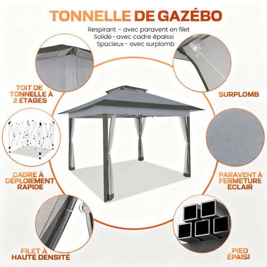 Dotée d'un sac de transport, la tonnelle pliante peut être facilement rangée dans le coffre de la voiture pour profiter de la vie en plein air à tout moment et en tout lieu ! RELAX4LIFE Tonnelle de Jardin Extérieur 3x6 M avec 6 Parois Amovibles, Barnum 3x6 en PE Imperméable, Sac de Transport, Protection Solaire, Montage Facile, pour Marché Fête De plus, la toile revêtue argenté vous offre également une protection efficace au soleil et à la pluie légère. Barnum Jardin Pliable Anti-UV RELAX4LIFE Tonnelle Pliante Pop-Up Avec Moustiquaire, Tonnelle De Jardin Extérieur Hexagonale, 2 Tonnelle Hauteur Réglable Sac Le réglage flexible sur 3 niveaux de hauteur permet d'optimiser l'ombrage selon l'angle du soleil. Caractéristiques principales : Espace large pour accueillir 4-6 personnes en toute détente Hauteur réglable sur 3 niveaux pour optimiser l'effet ombrageux Design pliable, installation facile en 3 étapes sans outils Bouton de déverrouillage intelligent pour un démontage rapide Cadre métallique épais pour garantir stabilité et résistance au vent 9 piquets de sol et 4 cordes antivent pour une sécurité accrue Tissu Oxford avec revêtement argenté offrant une protection solaire Tonnelle pliante avec un sac de transport pour un transport facile Spécifications techniques : Couleur : Gris/Beige Matériau : Tissu Oxford, Métal Dimensions du Produit : 365 x 225 x 270/255/240 cm (L x l x H) 3 Hauteurs Réglables : 270/255/240 cm Hauteur du Bord du Toit : 190/175/160 cm Dimensions du Sac de Transport : 94 x 21 x 21 cm (L x l x H) Poids Net : 12,4 kg Contenu de la livraison : 1 x Tonnelle de Jardin 1 x Sac de Transport 4 x Cordes à vent 9 x Piquets de Sol 1 x Manuel d'Instructions Avertissement De Sûreté Pour prolonger sa durée de vie, il n'est pas reccomandé d'utiliser la tonnelle en cas de fortes pluies et vents, veuillez donc la ranger par mauvais temps ou vous n'en avez pas besoin., Cordialement. RELAX4LIFE Tonnelle Pliante de Jardin 3,6x3,6 à Double Toit, Barnum Pliant en Tissu Oxford, Hauteur Réglable 264-284 CM, Protection UV, Sac à roulettes... Veuillez éviter de l’utiliser par mauvais temps. OMBRE SPACIEUX : La hauteur du barnum peut être réglée sur 3 positions (270/255/240 cm), vous permettant de l'ajuster selon l'angle du soleil pour optimiser l'effet ombrageux. RELAX4LIFE Tonnelle de Jardin 3 X 3 M avec Moustiquaire Amovible... Pratique à transporter en toute occasion, comme en pique-nique, en camping ou au marché, elle vous permet de profiter d'un abri où que vous soyez. Équipée d'un bouton de déverrouillage intelligent, elle peut être démontée en un instant, vous faisant gagner du temps. TOILE DE PROTECTION DE QUALITÉ : La tonnelle pliable est fabriquée en tissu oxford haute densité qui présente une résistance à l'abrasion. Grace au design pliable, aucun outil n'est nécessaire et l'installation se fait en seulement trois étapes. STRUCTURE STABLE : La structure en métal robuste assure à la tonnelle pliante une excellente stabilité et résistance au vent.