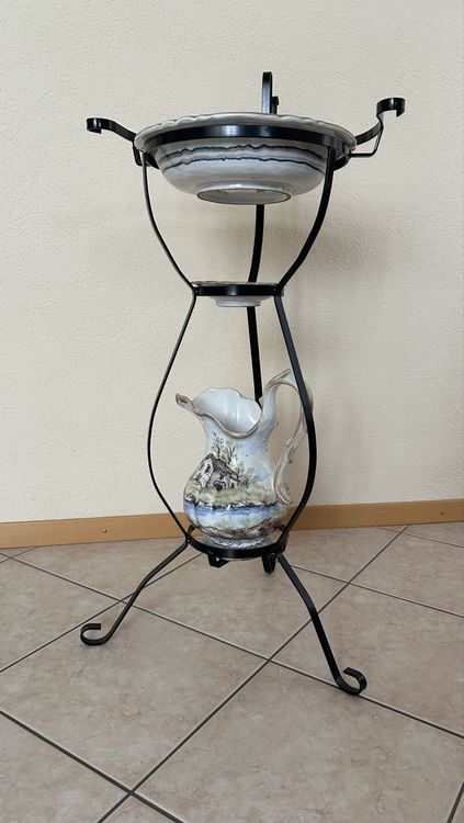 Dessus de puit en fer forgé complet - Brocante en ligne Apportez une touche authentique et rétro à votre intérieur avec cette bassine émaillée sur pied en fer forgé, idéale comme élément décoratif dans une salle de bain, une chambre d'hôtes, une entrée ou même une boutique au charme ancien Ensemble Décoration Campagne Chic Bassine En Cuivre Avec Pied En Fer Forgé Sur SA - Antiquités Ensemble Lavabo Ancien Apportez une touche d’élégance rustique à votre intérieur avec ce superbe ensemble décoratif composé d’une bassine émaillée sur pied et d’une cruche assortie. Le support en fer forgé noir assure une excellente stabilité tout en valorisant l’esthétique vintage de l’ensemble. Il s'agit d'un ensemble vintage composé d'une cruche et d'une grande bassine assortie. ... Lavabo ancien avec support lavabo bassin cruche porte-savon pot de... Inspiré des lavabos d’antan, il est idéal pour une décoration rétro ou campagne chic, que ce soit dans une salle de bain, un hall d’entrée, une chambre d’hôtes ou un commerce de charme. 🧵 Design d'inspiration ancienne – Idéal pour une décoration vintage, maison de campagne, salle de bain d’hôtes ou vitrine rustique. Convient pour eau ou usage décoratif. 💧 Cruche assortie incluse – Hauteur 34 cm, base 17 cm, largeur totale 28 cm avec anse.