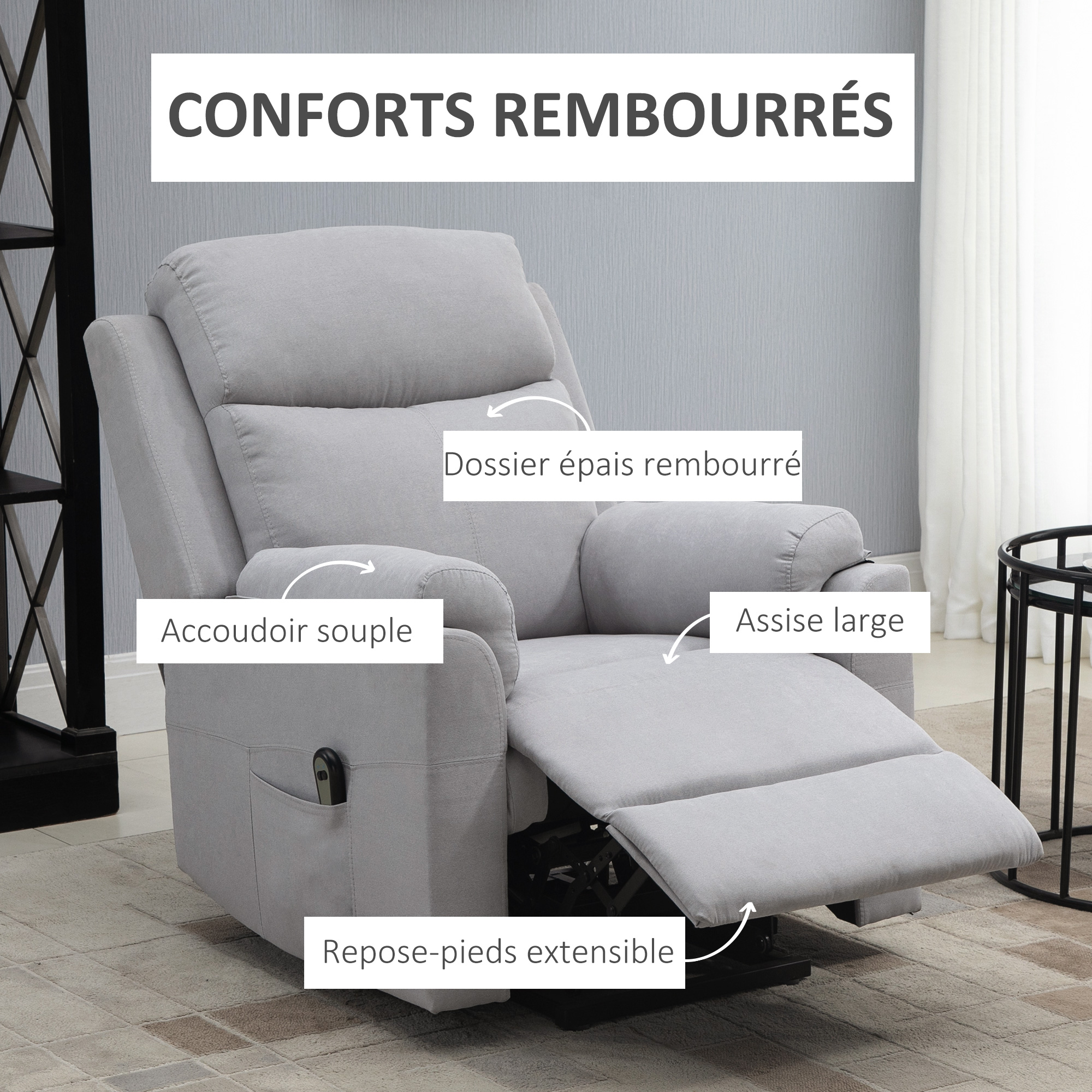 Luxuriöser Komfort: Erleben Sie höchsten Komfort im atmungsaktiven, strapazierfĂ€higen Stoff mit Leinenoptik, gestĂŒtzt durch Schaumstoffkissen hoher Dichte. Design surchargĂ© du fauteuil pour seniors avec rembourrage Ă©pais pour plus de confort Fauteuil Relax Inclinable Repose-pieds Fauteuil De Massage Inclinable Avec Repose-pied - Bois Tissu Gris Fauteuil Relaxant Fauteuil inclinable HOMCOM manuel avec fonction de relaxation, aspect... Ressorts ensachĂ©s, ressorts en S et bandes Ă©lastiques travaillent ensemble pour fournir un soutien supĂ©rieur Veuillez noter : Cet article est expĂ©diĂ© et livrĂ© dans des boĂźtes sĂ©parĂ©es, les dĂ©lais de livraison peuvent varier selon le carton Contenu de l'emballage - 1 fauteuil de relaxation - 1 manuel (français non garanti) Retrait de la presse talon/jambe pour l'ajustement du repose-pieds (ZurĂŒckgelehnt) 76B x 160T x 83H cm., Belastbarkeit: 150 kg. MĂŒheloses ZurĂŒcklehnen: Lehnen Sie sich entspannt zurĂŒck und genieĂen Sie das ZurĂŒcklehnen bis zu 140° mit nur einem Handgriff des Relaxsessels am manuellen Schnallen, perfekt um in Ihr Lieblingsbuch zu versinken oder Ihre bevorzugte TV-Show zu sehen. AprĂšs une longue journĂ©e, asseyez-vous dans le fauteuil de relaxation Homcom et relĂąchez le stress. Stabil und Elegant: Dieser TV Sessel ist mit einem stabilen Rahmen aus Metall und Massivholz gefertigt und vereint StĂ€rke mit stilvollem Design, mit einer TragfĂ€higkeit von bis zu 150 kg. Un siĂšge auquel vous ĂȘtes toujours heureux de revenir. Le dossier inclinable peut ĂȘtre rĂ©glĂ© jusqu'Ă 140 ° grĂące Ă la commande manuelle par boucle · Retrait de la presse talon/jambe pour l'ajustement du repose-pieds... Zum Aufstehen einfach die Beine oder die Fersen drĂŒcken, um die FuĂstĂŒtze sanft einzuziehen. Sein puristisches, minimalistisches Design integriert sich perfekt in jede Umgebung und bietet sowohl FunktionalitĂ€t als auch Ă€sthetische Eleganz. Le tissu respirant et durable du fauteuil inclinable aspect lin et le rembourrage luxuriant de l'assise et du dossier offrent un confort durable. HOMCOM Fauteuil inclinable avec repose-pieds, fonction allongĂ©e