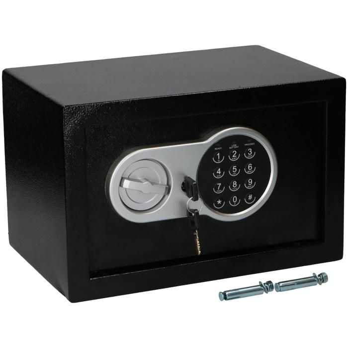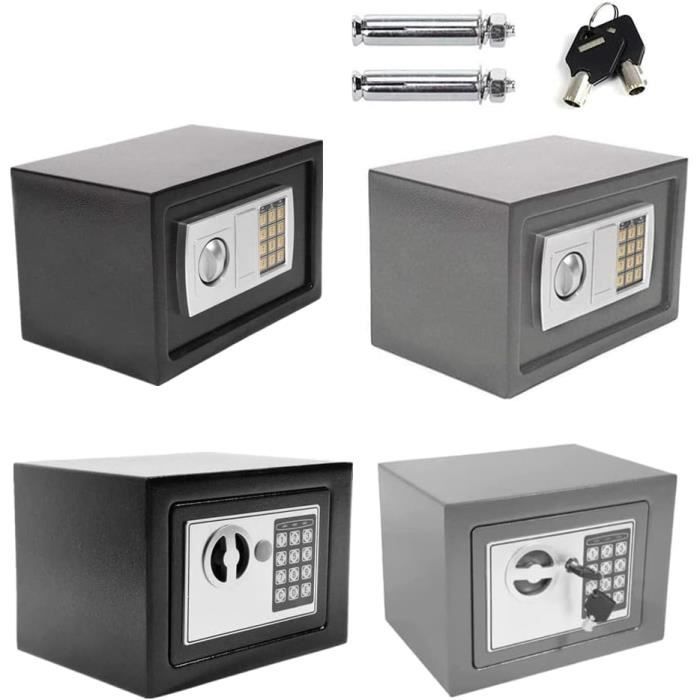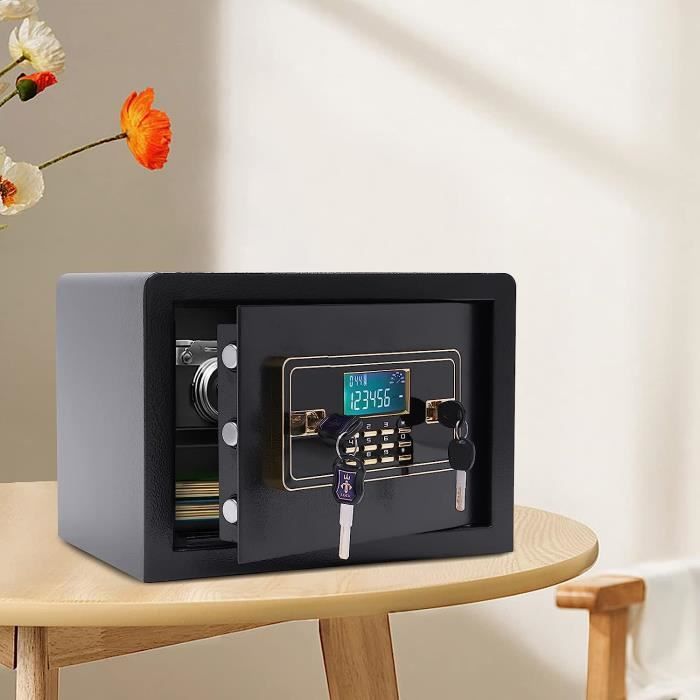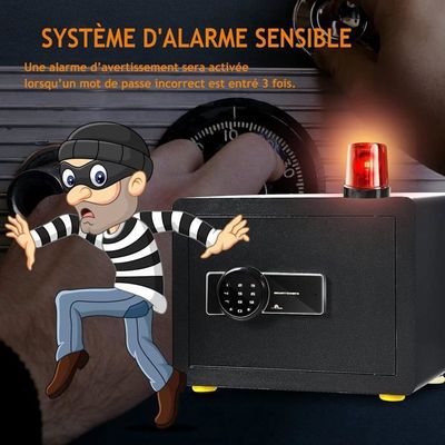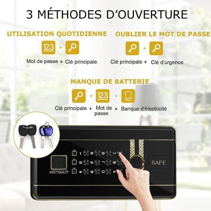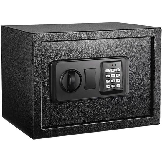 Système d'alarme intelligent & 2 modes d’alimentation : Il y a un système d’alarme est installé dans le coffre-fort, le système d’alarme sonore et lumineuse sera déclenché en entrant directement « * » ou en entrant le mot de passe incorrectement 3 fois. Vous pouvez définir de 3 à 8 codes pour ouvrir le coffre-fort en conjonction avec la clé principale. Coffre Fort Anti Indiscrétion Coffre-fort Avec Serrure à Code électronique, Coffre-fort Coffre-fort électronique Avec Alarme GOPLUS Coffre-fort avec Serrure à Code Électronique, Coffre-fort en... Espace vaste et flexible : La taille du coffre-fort est de 36,5 x 37,5 x 59 cm, ce qui offre un grand espace. L’intérieur spacieux avec étagère amovible offre votre commodité. 3 méthodes de déverrouillage : Le coffre-fort est équipé d'un verrouillage numérique de haute sécurité et des clés. Vous pouvez fixer le coffre-fort au mur pour gagner de la place. L'intérieur est équipé d'un petit coffre-fort avec un code individuel pour stocker les objets de valeur. Caractéristiques : Boîtier en acier robuste et boulons anti-crochetages pour une excellente protection de sécurité Assez d'espace avec 1 étagère mobile et crochets pour ranger divers objets de valeur Coffre-fort avec un système d’alarme sécurisé pour empêcher le vol d’objets Vous pouvez configurer facilement 3 à 8 mots de passe selon le manuel Mot de passe anti-indiscrétion assure que personne d'autre ne verra le mot de passe Coffre-fort peut être alimenté par 4 piles AA (non incluses) ou des piles externes Spécification : Couleur : Noir Matière : Acier Dimensions du produit : 36,5 cm x 37,5 cm x 59 cm (L x l x H) Hauteur de l'étagère au fond : 10 cm - 24 cm Poids net : 23,7 kg Poids brut : 26,6 kg Livraison : 1 x Coffre-fort 2 x Clés principales 2 x Clés d'urgence 1 x Instructions Lorsque la batterie est faible, vous pouvez la remplacer ou connecter une batterie externe pour l’alimenter. En outre, les boulons anti-crochetages sont conçus pour offrir une sécurité supplémentaire à vos biens importants tels que l'argent, les bijoux, les documents, etc. Serrure combinaison acier Boîte rangement code mécanique portable... De plus, il y a des crochets pour les clés derrière les portes. Design anti-indiscrétion & Large application : Ce coffre-fort dispose d'un mot de passe anti-indiscrétion, qui le protège des regards indiscrets malveillants. Excellente protection de sécurité : Le coffre-fort est fabriqué en acier épais de haute qualité afin de garantir une robustesse maximale et de résister à de fortes forces destructrices. Electronic Home Mini Coffre-Fort Coffre-Fort Numérique En Acier Avec 2