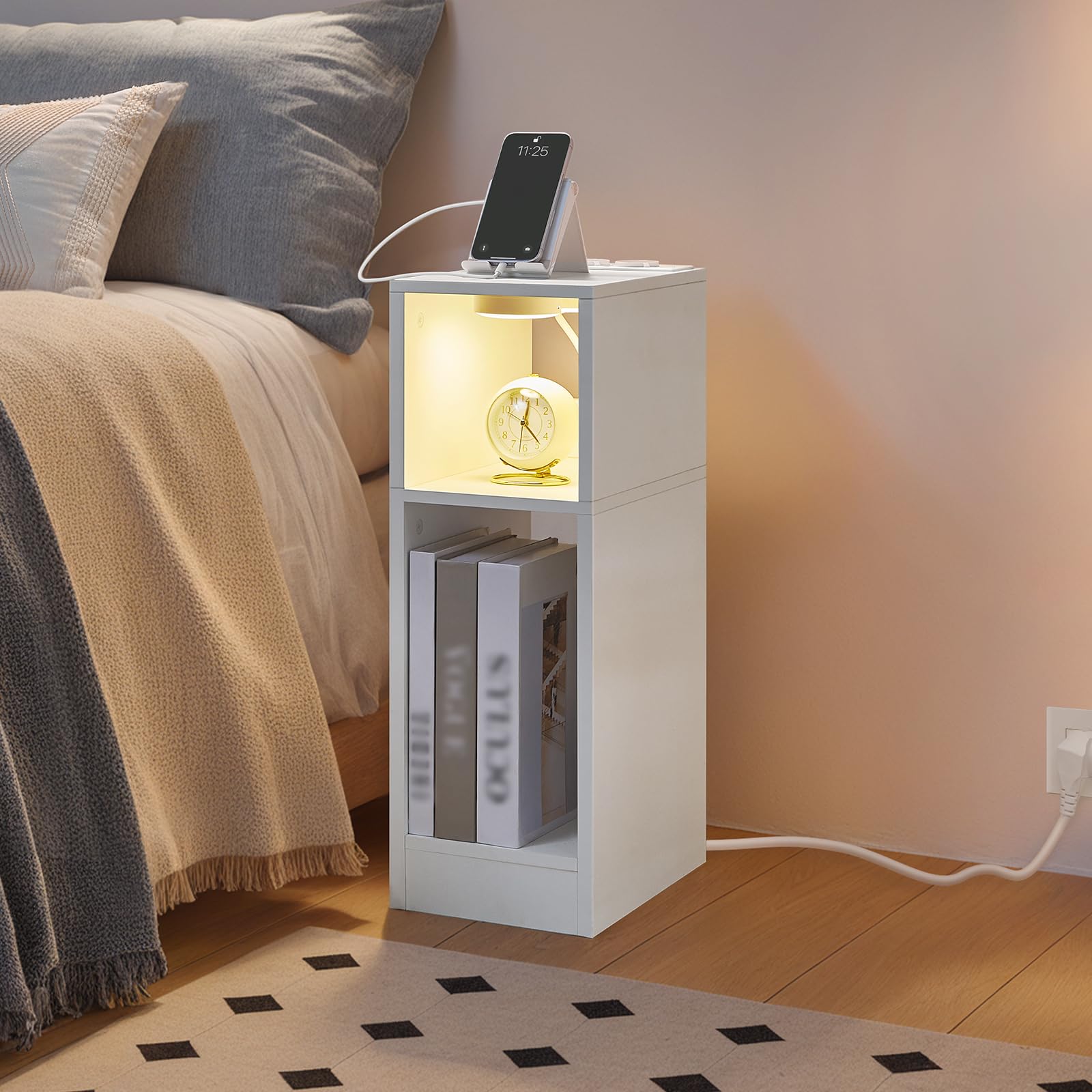 MAHANCRIS Table Basse, Table d'Appoint avec étagère de Rangement, Table La multiprise électrique intégrée vous permet de charger rapidement vos appareils électroniques. Dotée d’un détecteur intelligent, cette lampe s’éteint automatiquement, offrant à la fois commodité et économie d’énergie. L’espacement de stockage est suffisant pour bien ranger vos articles du quotidien Tables De Chevet Pour Adulte MAHANCRIS Table Basse Avec Station De Charge, Table D'Appoint En Table Nuit Rechargeable Lampes Détecteur Caractéristiques : - Couleur : Blanc - Matériaux : Panneau d’Aggloméré - Dimensions : 29 x 20 x 60 cm (L x l x H) - Poids : 4,7 kg - Capacité de charge maximale statique : 15 kg Livraison : - 1 x Table - 1 x Multiprise Électrique - 1 x Lampe LED à Détection - 1 x Kit d’Accessoires - 1 x Mode d’Emploi (FR) MAHANCRIS Précautions : - Veuillez protéger la lampe à détection de l’eau. Le passe-câble facilite une gestion des fils MAHANCRIS Table Basse, Table d'Appoint avec étagère de Rangement, Table... Station de charge pratique : La station de charge dispose de 2 prises standards, de 2 ports USB et d’un câble d’alimentation de 1,5 m, permettant de recharger votre lampe, téléphone, ordinateurs. Rôle polyvalent : Cette table d’appoint s’adapte à plusieurs rôles dans différents espaces, tels que table de chevet, étagère. Sa capacité de charge atteint jusqu’à 15 kg, pouvant supporter des objets du quotidien Solide et durable : La table de nuit est fabriquée à partir de panneaux d’aggloméré de haute qualité, offrant une structure robuste et une excellente durabilité.