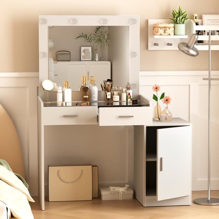 La coiffeuse dispose d'un miroir coulissant avec une taille et une position parfaites pour le maquillage quotidien ou le coiffage. Coiffeuse avec éclairage LED et miroir rectangulaire surdimensionné,110x40x139.5cm,Blanc | Leroy Merlin Facile à monter : grâce aux instructions illustrées et détaillées (français non garanti) et aux accessoires fournis, la coiffeuse avec éclairage est rapide et facile à assembler, ce qui en fait un cadeau idéal. Etagere Chambre Zeaper Coiffeuse Avec éclairage LED, Luminosité Réglable, Coiffeuse Avec Miroir, 5 Tiroirs, 4 étagères Ouvertes, Coiffeuse Moderne Pour Chambre à Coucher Table De Maquillage Tiroirs Imperméable et facile à nettoyer. En combinaison avec une LED à intensité variable avec 3 modes de température de couleur, elle offre un éclairage de maquillage optimal. Zeaper Coiffeuse avec iroir LED et chaise, 3 tiroirs, 5 étagères... Meuble de salon durable et pratique. Le plateau de table est résistant aux rayures et facile à nettoyer. Coiffeuse de qualité supérieure : la coiffeuse est fabriquée en MDF de qualité supérieure, structurellement stable, résistante à l'humidité et durable. Le miroir est équipé de rails coulissants en métal pour assurer une ouverture et une fermeture fluides. Le plateau de table est résistant aux rayures et facile à nettoyer. LED réglable : la coiffeuse est livrée avec un miroir... Coiffeuse de haute qualité : les coiffeuses sont fabriquées en MDF de haute qualité, stable, résistant à l'humidité et durable. Faites briller votre beauté. Espace de rangement spacieux : la coiffeuse dispose de 5 tiroirs pour le maquillage, les bijoux et autres petits objets. Coiffeuse robuste, belle et élégante. Coiffeuse indispensable : que ce soit dans la chambre, le salon ou la chambre d'hôtel, la coiffeuse est un meuble indispensable pour votre vie quotidienne et vos soins.
