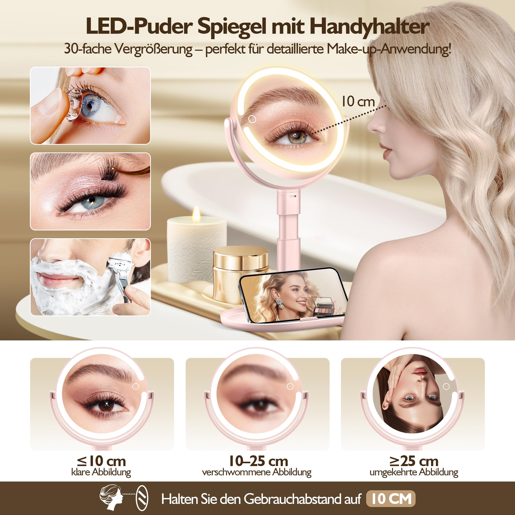 Le miroir rotatif à 360° permet une orientation optimale de la lumière. Miroir Lumineux MOMOKUBA Miroir Cosmétique Avec éclairage, Miroir Grossissant 20x, Miroir Grossissant Réglable En Hauteur Des Deux Côtés, Miroir Cosmétique 3 Couleurs Pour Maquillage De Table, Rose Vif Miroir Grossissant X10 Éviter l'exposition à l'eau pour prévenir les risques électriques. Cadeau idéal dans un emballage élégant - Miroir grossissant x 30 dans un élégant coffret cadeau - Prêt à offrir pour les anniversaires, les vacances ou les anniversaires. Avertissement De Sûreté Attention : Risque de basculement. Un support de smartphone intégré vous permet de regarder des tutoriels pendant le maquillage Aidodo Miroir à Maquillage LED, Miroir Grossissant 5X Détachable Avec un léger toucher, la couleur change entre la lumière froide, la lumière du jour et la lumière chaude. Fabriqué en matériau léger, ce miroir ne pèse que 0,61 kg. En outre, ce miroir grossissant dispose d'une fonction d'arrêt automatique de 30 minutes et enregistre la dernière luminosité. Trois modes : miroir de bureau, à main ou mural - Changement facile grâce à la rotation à 360°. Design démontable adapté aux voyages : se décompose en 3 parties compactes pour un rangement facile, parfait pour les bagages à main ou les sacs de sport. Facile à utiliser : le miroir de maquillage 20x avec lumière dispose d'un miroir de maquillage lumineux 1 fois et 20 fois avec un design rotatif à 360... Miroir De Maquillage Grossissant 10 Fois Miroir De Maquillage De Poche Avec Lumières Miroir... Sa polyvalence le rend idéal pour les jeunes femmes, les personnes âgées et les patients atteints de cataracte – résout efficacement les problèmes de maquillage courants. La longue pression régule la luminosité pour tous les environnements. Batterie rechargeable de 2000 mAh pour une semaine d'utilisation : avec seulement 3 heures de charge, la batterie alimente votre maquillage quotidien pour une semaine entière. Description du produit Miroir grossissant 1x/30x double face : ce miroir grossissant avec lumière offre un grossissement 1x pour le maquillage quotidien et un grossissement 30x pour des activités précises : épilation des sourcils, pose de lentilles de contact, pose de faux cils ou nettoyage des pores.