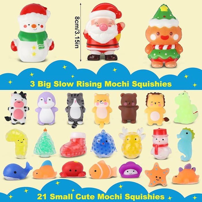 Un grand assortiment comprend 24 squishies mochi différentes, dont Galaxy Mochi Santa Mochi. Goodies Fête De Noël PIMPIMSKY Calendrier De L'Avent 2022 ,Des Jouets De Noël,des Boîtes En Jouets Anti-stress Noël Déplier un nouveau Mochi artisanal chaque jour, c'est comme se lancer dans un voyage enchanteur, rendant le compte à rebours des vacances vraiment mémorable. Un cadeau chaque jour jusqu'à Noël. 🎉【Enrichissement de tradition intrigant】Élevez votre compte à rebours de Noël avec notre calendrier de l'Avent Mochi de Noël. Il apporte chance et bonheur, ce qui en fait un ajout parfait à votre décoration intérieure et une partie précieuse des célébrations de Noël. Calendrier de l'Avent Disney de 24 jours, boîtes surprises de Noël Célébrez la joie de la saison des fêtes et apportez la joie festive à tout le monde avec ce charmant calendrier de l'Avent qui ne manquera pas d'être un succès lors des fêtes. Chaque jouet squishy est fabriqué à partir de silicone de haute qualité et non toxique, qui est doux et souple. Déplier un nouveau gnome en peluche fabriqué à la main chaque jour, c'est comme se lancer dans un voyage enchanteur, rendant le compte à rebours des fêtes vraiment mémorable. Comme c'est amusant de compter à rebours pour Noël. Célébrez la joie des fêtes de fin d'année et apportez la joie des fêtes à tout le monde avec ce charmant calendrier de l'Avent qui sera certainement un succès lors des fêtes. CALENDRIER DE L'AVENT MOCHI SQUISHY 2025 : Ce calendrier du compte à rebours est conçu de manière unique avec un charmant et adorable jouet mochi squishy caché derrière chacune des 24 fenêtres Taille] Calendrier de l'Avent : 26 cm x 21 cm, jouets mochi de Noël : environ 5 cm x 3,5 cm, forme unique, couleurs vives, les enfants peuvent débloquer de nouveaux jouets surprises chaque jour avant le réveillon de Noël Il apporte chance et bonheur, ce qui en fait un complément parfait à votre décoration intérieure et un élément précieux des célébrations de Noël. C'est le moyen idéal d'ajouter de l'excitation et de l'anticipation à la saison des fêtes. ☃【Compte à rebours pour le cadeau de Noël】Le kit de fabrication de figurines et d'accessoires est livré dans une boîte de compte à rebours de Noël avec une petite « fenêtre » du 1er décembre à la veille de Noël, ce qui gardera vos petits excités et impatients d'ouvrir chacune des surprises jour après jour, plus excitant que le calendrier traditionnel de chocolat ou de bonbons. Apportez une touche d'excitation festive à votre compte à rebours de Noël avec notre calendrier de l'Avent Mochi de Noël.