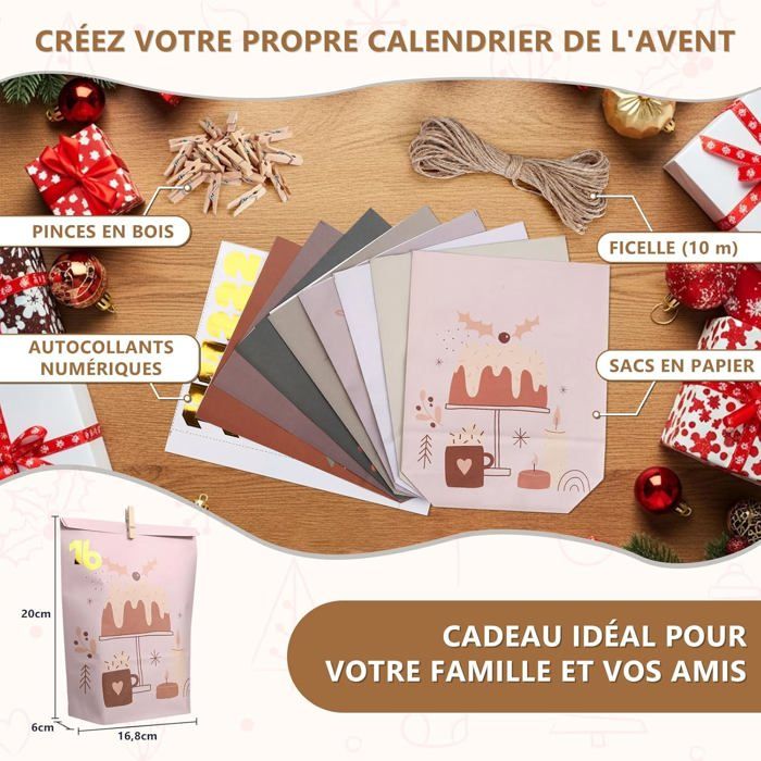 Calendrier De L Avent DazSpirit 24 Calendriers De L'Avent à Calendrier de l'Avent Vide a Replir Soi ee 2023 Fee Hoe Enfant... Calendrier De L'avent Bois Calendrier De L Avent A Remplir Calendrier De L'Avent à Replir Calendriers De L'avent 🎄Design unique : Notre calendrier de l'avent à remplir est imprimé avec des éléments de vacances classiques, tels que le Père Noël, les arbres de Noël, les bonhommes de neige, les rennes et d'autres motifs. Chaque sac de calendrier de l'Avent mesure environ 9,4 x 14 cm/3,7 x 5,5 pouces une fois plié, ce qui le rend parfait pour remplir de nombreux cadeaux de petite à moyenne taille. Calendrier de l'Avent DIY: Vous recevrez 24 pochette calendrier de l'Avent (12 modèles différents, 2 de chaque style), 24 numérique autocollants, 24 clips en... 🎄Matériau de haute qualité: Ce sac pour calendrier de l'Avent vide est fait de papier kraft de haute qualité et est réutilisable. 🎄Large application : Les Sacs en Papier de calendrier de l'avent sont parfaits pour emballer des bonbons, des biscuits, des jouets, des chocolats, des bijoux ou d'autres petits cadeaux. Avant Noël, préparez de nouvelles surprises pour vos enfants, vos proches et vos amis avec différents sac pour calendrier de l'avent chaque jour pour transmettre la chaleur et la chaleur de ces vacances. Le calendrier de l'avent a faire soi meme s'adapte parfaitement à vos décorations de Noël et vous apporte une forte ambiance de Noël