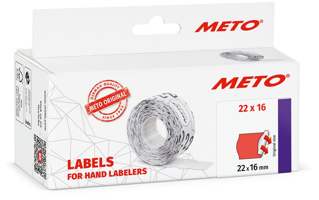 Les prédécoupes dans le papier support et la forme des étiquettes garantissent un transfert précis de celles-ci. Encreur pour étiqueteuse manuelle METO ligne Classic S & M - étiquetage... Les étiquettes pour étiqueteuses manuelles Meto conviennent pour l’étiquetage de prix, de la date, de n° d'articles, de n° de lots / colis, de plaques signalétiques, de matricules de salariés etc. En règle générale, les étiquettes ne se laissent pas décoller sans être endommagées. étiquettes Alimentaires Permanentes Certifiées ISEGA Avery Etiquettes Autocollantes Meto Étiquettes Pour étiqueteuse Manuelle, Réf. 9506161 (22 X étiquettes Pour Etiqueteuse Rouleaux étiquettes Pour étiqueteuse Manuelle Vous aussi, faites confiance à l’original., Faites confiance à Meto. Les étiquettes Meto sont la solution idéale pour marquer et identifier vos produits avec efficacité, partout où des informations précises sont requises. Vous bénéficiez ainsi d'une haute vitesse de répétition d’impression et d’une meilleure efficacité au travail. Étiquettes made in Germany, autorisées et certifiées pour le contact direct avec les denrées alimentaires Taille d’étiquettes 22 x 16 mm pour étiqueteuses 2 lignes, forme de l’étiquette : bord ondulé ; adhésif : adhésives permanentes ; couleur : rouge fluo L’étiquette adhésive se laisse difficilement décoller du support, ce qui vous évite les tentatives d’inversion d’étiquettes par les clients. Grâce au format prédécoupé universel assurant un transfert précis, les rouleaux d’étiquettes conviennent à toutes les étiqueteuses manuelles courantes, et particulièrement au modèle Meto Arrow M. METO Set d'étiqueteuses Basic M - prix, numéro d'article (2 lignes, 16 chiffres pour étiquettes 22 x 16 mm, prêt pour une utilisation immédiate), 1x étiqueteuse manuelle Share Les étiquettes Meto à adhésif permanent offrent une adhésion permanente relativement forte et peuvent être collées sur pratiquement tous les supports ; elles sont autorisées pour le contact direct avec les denrées alimentaires sèches, humides et non grasses (certification ISEGA). Particulièrement bien adapté pour l’étiqueteuse manuelle Meto Arrow M AVERY - Pince à étiqueter 2 lignes (10+8 caractères)+ 1 rouleau encreur