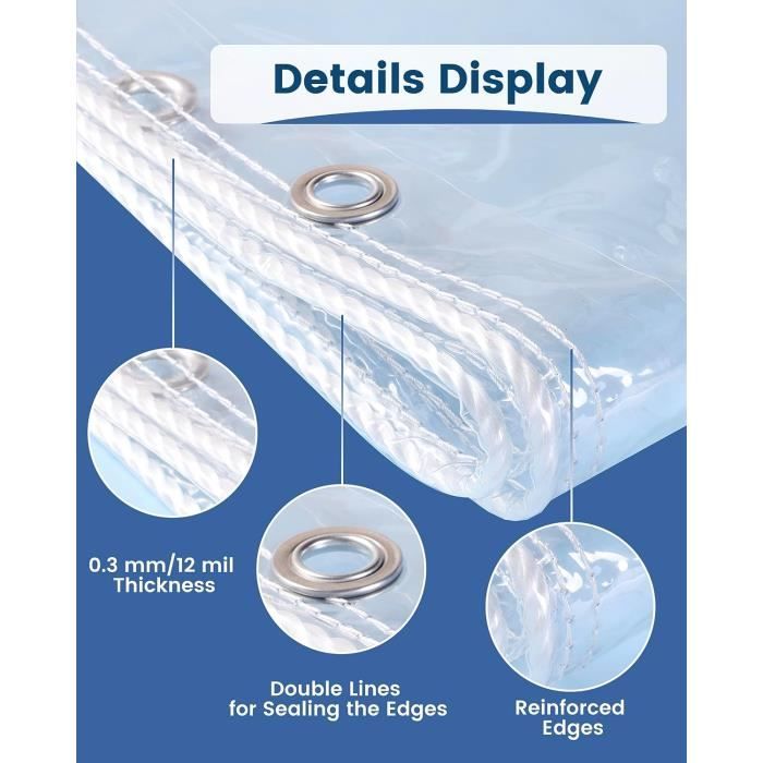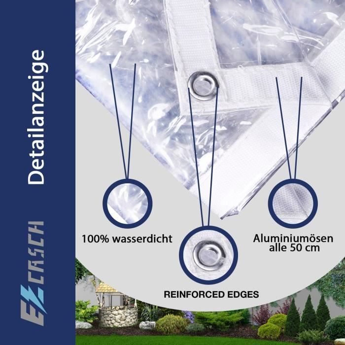 Bâche en PVC 420 g/m² Extra imperméable avec œillets renforcés pour Haute transparence & Isolation thermique : La bâche transparente offrant une transparence impressionnante de 99%, fonctionne comme un excellent émetteur de lumière, facile à nettoyer et à plier, pas facilement déformée, pratique pour le stockage et l’organisation Protection Extérieure Transparente Bâche Transparente Extérieur Avec Oeillets, 450g-m² Bâche En Plastique Bâche Imperméable 450g/m² Avec Oeillets 14 Mil Bâche Transparent Epaissi: Dulepax Bâche transparente en polychlorure de vinyle (PVC) de 450 g/m², épaisse, robuste, résistante à la déchirure, résistante à la lumière du soleil, en même temps transparente et imperméable. Haute transparence & Isolation thermique : La bâche transparente offrant une transparence impressionnante de 99%, fonctionne comme un excellent émetteur de lumière, facile à nettoyer et à plier, pas facilement déformée, pratique pour le stockage et l’organisation. Matériau durable bâche transparente : toile en plastique PVC transparent, épaisseur : 0,35 mm, poids : 450 g/m², qui est souple, facile à plier et à ranger... Esthétique et pratique, très adapté à une utilisation dans les serres, les clôtures de balcon et autres environnements extérieurs. Comme une couche protectrice pour vos fleurs et vos légumes, leur permettant d'absorber la lumière du soleil tout en restant à l'abri du vent et de la pluie. Attention : En raison de l’emballage, il peut avoir un léger pli, juste disponible dans de l’eau chaude pour être plat. Plusieurs tailles : Nous avons 16 tailles peuvent être sélectionnées, que vous cherchiez à protéger les plantes de serre ou les meubles d’extérieur ou à créer un rythme abrité, cette bâche répondra parfaitement à vos besoins.