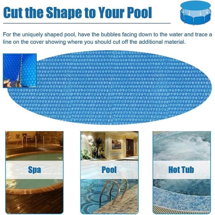 240 cm/8 pieds; 350gType 3 : Diamètre rond : env. 260 x 170 cm/8,5 x 5,6 pieds ; 400gType 5 : rectangle : env. 【Isolez la litière】Avec une couverture de piscine de sécurité, vous passez moins de temps à la nettoyer, la couverture de piscine aide à garder votre piscine exempte de feuilles et de débris lorsqu'elle n'est pas utilisée. 180 cm/6 pieds ; 250gType 2 : Diamètre rond : env. trigano Bestway - Bâche à bulles ronde ou ovale pour piscine 300 cm/10 pieds ; 500gType 4 : rectangle : env. Taille et poids :Type1 : diamètre rond : env. Bâche à bulles solaire TRAHOO - Couverture de piscine ronde - Isolation... 【 Pas facile à décolorer 】 La couverture solaire de piscine est fabriquée en matériau PE de haute qualité, qui est imperméable, anti-poussière, sûr, ferme, peut être utilisé à plusieurs reprises, pas facile à casser ou à décolorer. Couverture Solaire Piscine - Bâche À Bulles Solaire | Film D'isolation Thermique Pour Piscine | Protecteur De Piscines En PE Pour Piscines Hors Sol Creusée, Résistant Aux UVFonctionnalité:1., Pour la conservation de la chaleur et la transparence : la couverture solaire pour piscine creusée peut être mise sur l'eau, les bulles peuvent fournir une isolation, garder votre eau chaude et vous permettre de profiter de la baignade., 2., Gardez la piscine propre : une couverture de piscine de sécurité est indispensable pour protéger votre piscine des feuilles, des débris et des déchets lorsqu'elle n'est pas utilisée., 3., Coupe libre : la couverture de piscine de grande taille est suffisante pour que vous puissiez l'utiliser, et vous pouvez couper la couverture de piscine pour s'adapter à la taille de votre baignoire ou de votre piscine, s'adapter à la plupart des piscines., 4., Matériau PE : la couverture solaire de piscine est fabriquée en matériau PE imperméable, qui est sûr et solide dans la structure, peut être utilisé à plusieurs reprises, pas facile à casser ou à se décolorer., 5., Large scène : couverture de rétention de chaleur. Assurez-vous que votre piscine reste chaude pendant les nuits fraîches et les jours nuageux. Film Isolant Thermique PE Pour Piscine Bâches Solaires Pour Piscine - Bâches Solaires Pour Piscine Bâche à Bulles Piscine Légère et portable : conçue pour les piscines extérieures, cette bâche solaire pour piscine est pliable et portable, assurant un rangement et un transport sans effort grâce à son design peu encombrant, ce qui la rend idéale pour une utilisation régulière dans divers environnements tout en conservant la facilité de manipulation et la... 【Utilisation facile】 La couverture de piscine peut être coupée librement, fixez la couverture de piscine sur le dessus de la piscine pour prolonger votre saison de baignade en gardant l'eau et la chaleur à l'intérieur et les débris à l'extérieur.