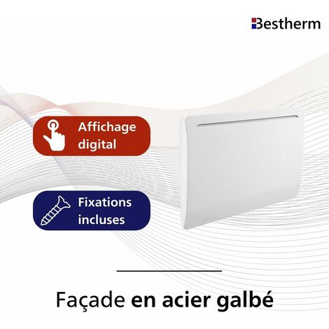 Avec son design discret et moderne, il chauffe efficacement une pièce jusqu'à 15 m² tout en optimisant l'espace disponible. Programmation : 3 programmes prédéfinis + 1 personnalisable Programmation intuitive Adaptez facilement votre chauffage à votre rythme grâce aux 3 programmes pré-enregistrés et à la programmation hebdomadaire personnalisable. Même après extinction, il continue à diffuser une chaleur agréable, pour un confort optimal et des économies d'énergie garanties. Sécurité : Détecteur de fenêtres ouvertes, sécurité enfant, protection anti-surchauffe, Matériau : Acier Thermostat : Ecran LCD intuitif Programmable écran LCD BESTHERM - Radiateur électrique Fixe à Inertie Sèche Céramique 1000W Bestherm ATLAS Horizontal Radiateur A Inertie Sécurité Complète: Protection anti-surchauffe, sécurité enfant et certification IP24 pour une utilisation sûre dans toutes les pièces, y compris la salle de bain Sécurité maximale Le radiateur est équipé d'une sécurité anti-surchauffe, d'une sécurité enfant, et possède une classe IP24 permettant une installation sécurisée en salle de bain. Technologie inertie sèche céramique Grâce à son cœur céramique haute densité, ARIA PLINTHE garantit une chaleur douce, homogène et durable. Normes et certifications : CE, et classe IP24 Bestherm lucca 1000w: au meilleur prix Fonctions intelligentes ARIA PLINTHE dispose d'un détecteur automatique d'ouverture de fenêtres qui active le mode hors-gel lors d'une baisse soudaine de température, évitant ainsi les consommations d'énergie inutiles. Design Compact: Dimensions optimisées de 30 cm x 81,4 cm x 12 cm, parfait pour les espaces étroits tout en garantissant une diffusion optimale de la chaleur avec sa puissance de 1500W Garantie : 2 ans + SAV basé en France Radiateur électrique fixe à inertie sèche céramique 1500W Bestherm ARIA... Optez dès maintenant pour ARIA PLINTHE 1500W Bestherm : discret, performant et économique pour votre quotidien. Contrôle Intelligent: Écran LCD tactile avec 3 programmes pré-enregistrés et programmation hebdomadaire personnalisable pour une gestion précise de votre chauffage selon vos besoins L'écran digital tactile LCD vous permet de contrôler simplement votre température et vos plages horaires, pour une gestion efficace et économique.