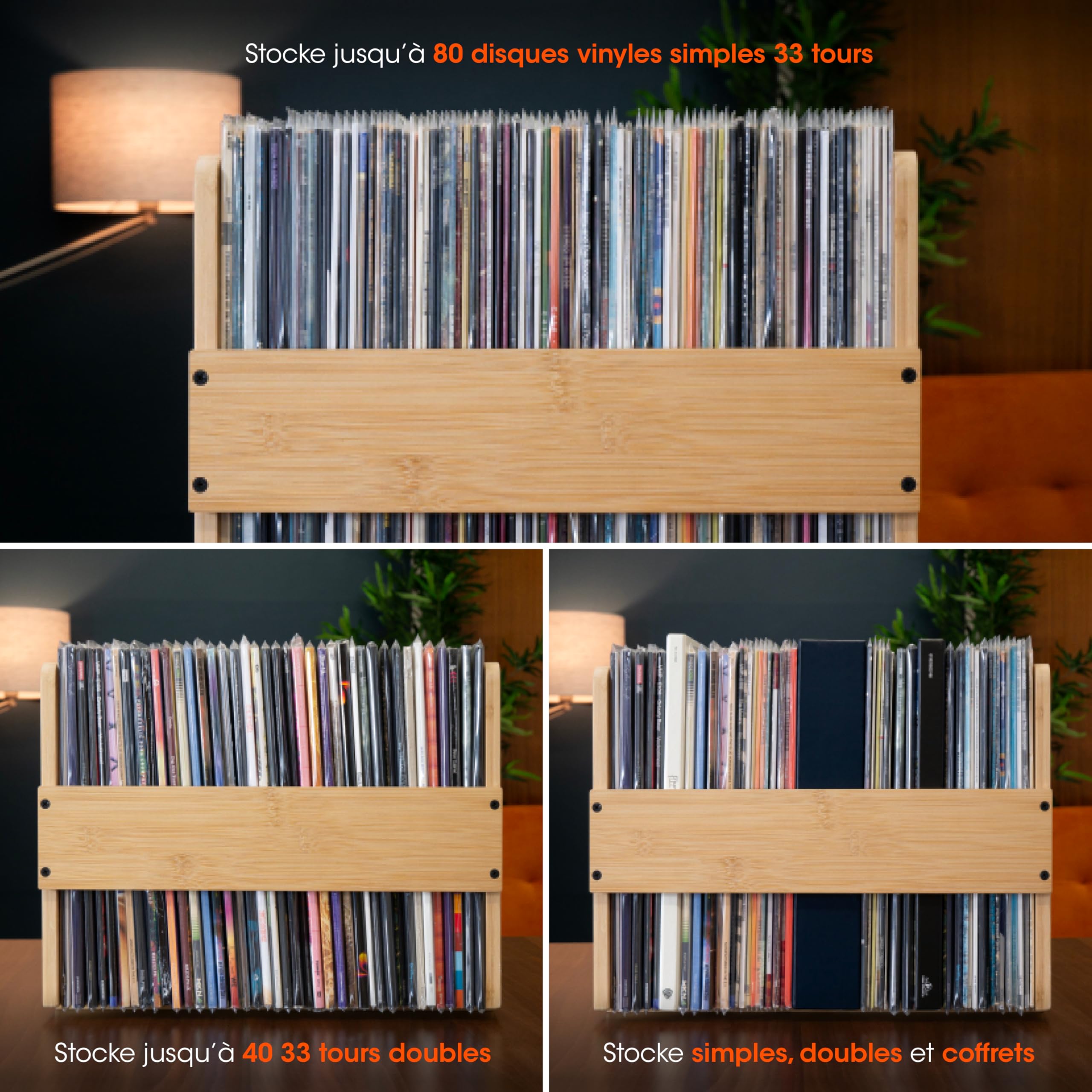 Design résistant et élégant Capacité extensible : Ce porte vinyle peut contenir entre 50 et 75 disques vinyles, selon l'épaisseur des pochettes. Organisation efficace : Avec ses 4 sections séparées par des séparateurs métalliques noir mat, le support de rangement vinyle 33 tours vous permet d'organiser vos disques par genre ou par artiste, afin qu'ils restent toujours bien rangés. Solide et durable, le bambou offre un style naturel et raffiné, tandis que les autocollants en mousse EVA à la base protègent vos meubles des rayures. Meuble pour rangement vinyles 33 tours Base solide en bambou Les 4 séparateurs métalliques noir mat vous permettent d'organiser facilement vos disques par artiste ou par genre, en les gardant toujours en ordre et à portée de main. Ce support Big Fudge, c'est le petit accessoire indispensable pour tout amateur de vinyles ! En beau bois de sapelli (qui rappelle l'acajou ou le noyer... Idée-cadeau : Recevez le range disque vinyle dans un emballage élégant, prêt à être offert à vos amis ou à vos proches passionnés de musique et amateurs de vinyles. À la recherche d'un support élégant et spacieux pour ranger vos vinyles ? Notre porte-vinyles en bambou est la solution idéale pour conserver et mettre en valeur votre collection. Le support de rangement vinyle 33 tours peut accueillir 50 disques sans extension et 75 avec extension. Meuble Rangement Vinyle BIG FUDGE Support En Bois De Hêtre Pour Disques Vinyles - Présentez Vos Favoris Design Naturel élégant Stable Vinyles 33 tours: Les must-have Protection fiable : Le rangement disque vinyle est équipé d'adhésifs en mousse EVA à la base, afin de protéger les meubles contre les rayures éventuelles, tout en garantissant un support stable et sûr pour vos disques.