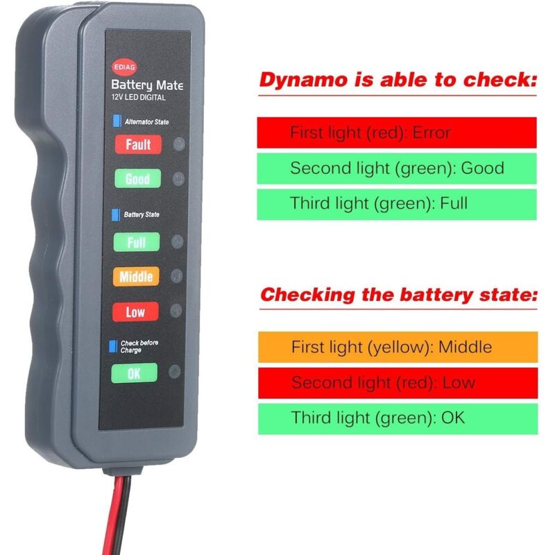 Testeur de batterie de voiture pratique, testeur d... - Grandado Voltmètre Voiture Digital 12V ~ 24V – Testeur de Batterie avec Affichage LED, à Brancher sur Allume-Cigare, Moniteur Portable de Batterie Auto pour Voiture... Testeur Alternateur LED 12V Voiture Batterie Testeur BM310 Numérique Alter... - Grandado Testeur Batterie Voiture Allume Cigare L'outil de test de batterie et d'alternateur 12V est conçu pour vérifier l'état de la batterie et de l'alternateur de votre véhicule. Grâce à un affichage LED clair, il indique la condition de la batterie et du circuit de charge Caractéristiques: Nom: Détecteur de batterie de voiture Méthode d'essai: Allume-voiture brancher Couleur: gris Matériel: abdos Afficher: Affichage lumineux tricolore LED Tension: DC 4-12V Taille du produit: 4,7 * 1,9 * 0,7 pouces Poids: Environ 100g Packege Inclus: 1 x unité principale 1 x manuel de l'utilisateur, 1., Pas de fuite, pas de chaleur, fonctionnement sûr., 2., exploité sans interruption, protection complète., 3., Affichage rapide et précis des résultats des tests de la batterie (ne coûte que 3 secondes)., 4., Il peut être détecté directement dans la voiture pour connecter le , briquet de voiture Fonctionnalités: 1., Pas de fuite, pas de chaleur, fonctionnement sûr., 2., exploité sans interruption, protection complète., 3., Affichage rapide et précis des résultats des tests de la batterie (ne coûte que 3 secondes)., 4., Il peut être détecté directement dans la voiture pour connecter le briquet de voiture , pas besoin de couper la batterie de la voiture, facile à utiliser., 5., Il montre l'état de santé de la batterie., 6., L'essai de signal dans les basses fréquences ne nécessite pas de charge externe., 7., Vérifiez directement si la tension de charge des voitures est nommal., 8., Détectez la tension de démarrage de la voiture., 9., Détectez l'état de surcharge de la batterie de la voiture., dix.