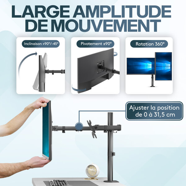 Offrant stabilité, réglabilité et immersion visuelle, il élimine vibrations et mauvais positionnements. Stabilité et durabilité éprouvées : la stabilité est cruciale pour les joueurs. Deux options de montage : vous pouvez fixer le support d'ordinateur NearHunb au bord d'un bureau à l'aide d'une pince ou d'un passe-câble, ce qui convient aux bureaux dont les bords ont une épaisseur comprise entre 0,99 et 6,6 cm. Accessoires Gaming d'Excellence :Le support d'écran gaming NearHub est conçu pour optimiser votre expérience de jeu. Support d'écran à Dual ressort à gaz eSTUFF (GLB227012 Remarque : Non compatible avec les écrans courbés. Construisez votre configuration Victory NearHub Support Écran PC 2 Écran pour 13 à 32 Pouces, Réglable en... Le système de gestion des câbles intégré permet de dissimuler les câbles, pour un bureau bien rangé et organisé. Vous vous battez encore avec des supports d'écran compliqués ? Position optimale de l'écran : le support réglable pour bureau permet une inclinaison de +90° à -45°, un pivotement à 180° et une rotation à 360°, avec un réglage en hauteur le long du mât pour un positionnement ergonomique. Support écran Gaming BONTEC Support Écran PC 2 Écrans Articulés, Bras Écran Compatible Moniteurs 13-32 Pouces, Pivot 360 Bras Double écran ErGear Support de oniteur pour écran de 13 à 32 Pouces, Support d... Livré avec tout le matériel de montage nécessaire, les outils et les instructions pour un assemblage simple.