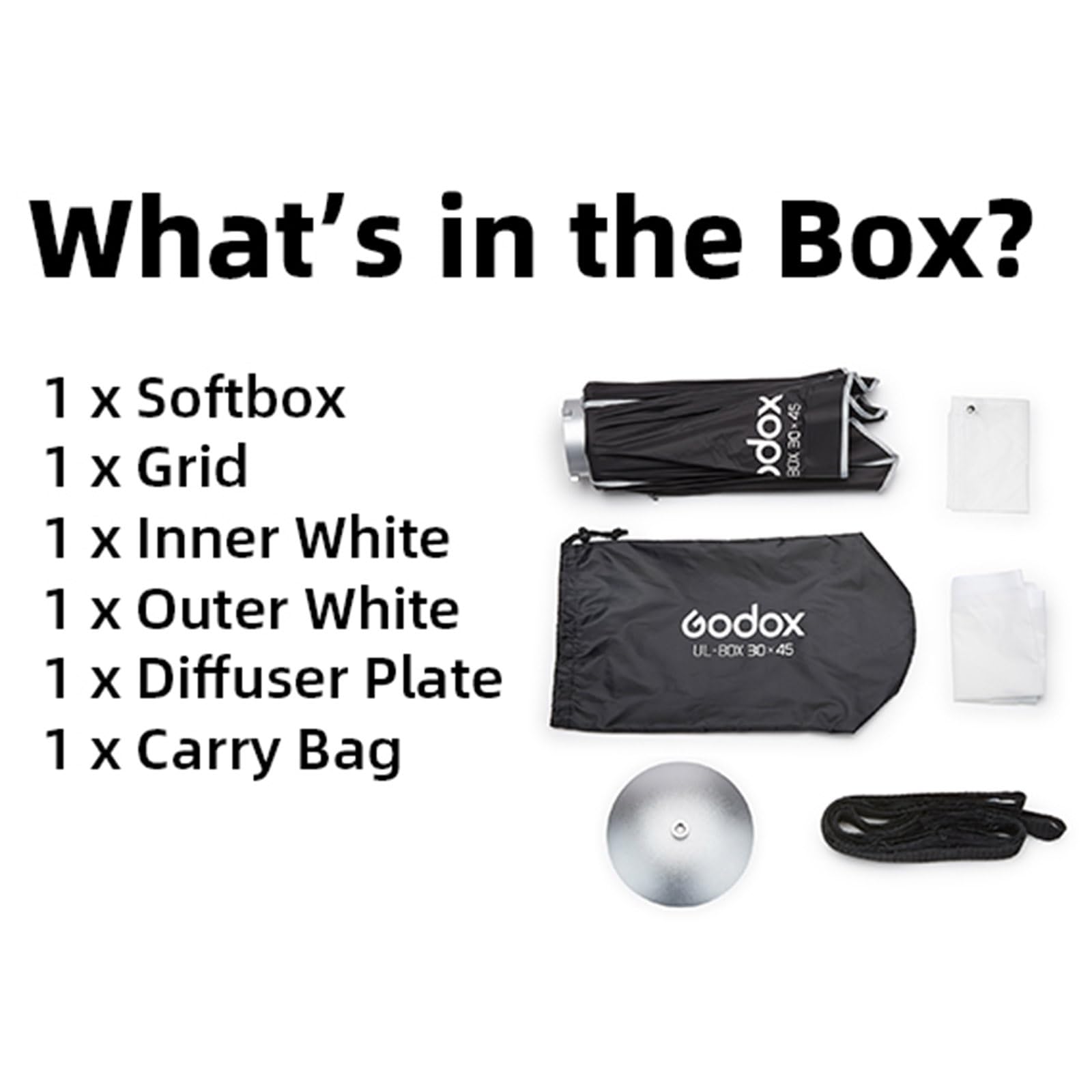 Godox – Softbox portátil plegable de 315in x 315in con soporte tipo S... Godox - Boîte à lumière Pliage Rectangulaire UL-BOX 30x45cm Tissu souple intérieur blanc / extérieur blanc amovible: apporte un effet lumineux uniforme et doux, ajuste la douceur de la lumière Grille: limite la gamme de lumière, réduit les débordements, contrôle fin de la lumière Disque de guidage: peut réaliser des effets lumineux de radôme similaires Tissu d'ombrage blanc extérieur: créez une lumière de contour pour un effet de lumière créatif Compatibilité étendue et adaptation flexible La série UL de softbox adopte une conception de baïonnette Bowens, compatible avec tous les flashes et éclairages LED utilisant cette monture. Softbox Léger Portrait Produit Godox UL BOX 30*45 Boîte à Lumière Multifonctionnelle à Accessoire Flash Photographe Studio En remplaçant le disque de monture (vendu séparément), elle peut s'adapter à différents systèmes d'éclairage, améliorant ainsi sa polyvalence et son interopérabilité. léger et portable, simple et facile à utiliser Léger, compact et pliable, le boîtier léger de la série UL combine mobilité et facilité d'utilisation pour créer des effets de lumière professionnels à tout moment, n'importe où, idéal pour les mariages, les portraits et les prises de vue en plein air. Combiné avec un disque de guidage, un tissu souple intérieur / extérieur blanc amovible, une grille et d'autres accessoires, il peut créer une belle lumière oculaire, ajuster la douceur de la lumière, contrôler avec précision la direction de la lumière, etc. Conception rapide, création efficace Le boîtier flexible de la série UL adopte une conception de parapluie rapide pliable et dispose d'une fermeture à glissière sur le côté, d'accessoires tels que le tissu flexible sans démontage pour un déploiement et un rangement rapides, correspondant à des scènes de prise de vue rapides telles que le studio ou l'extérieur, améliorant efficacement l'efficacité du revêtement.